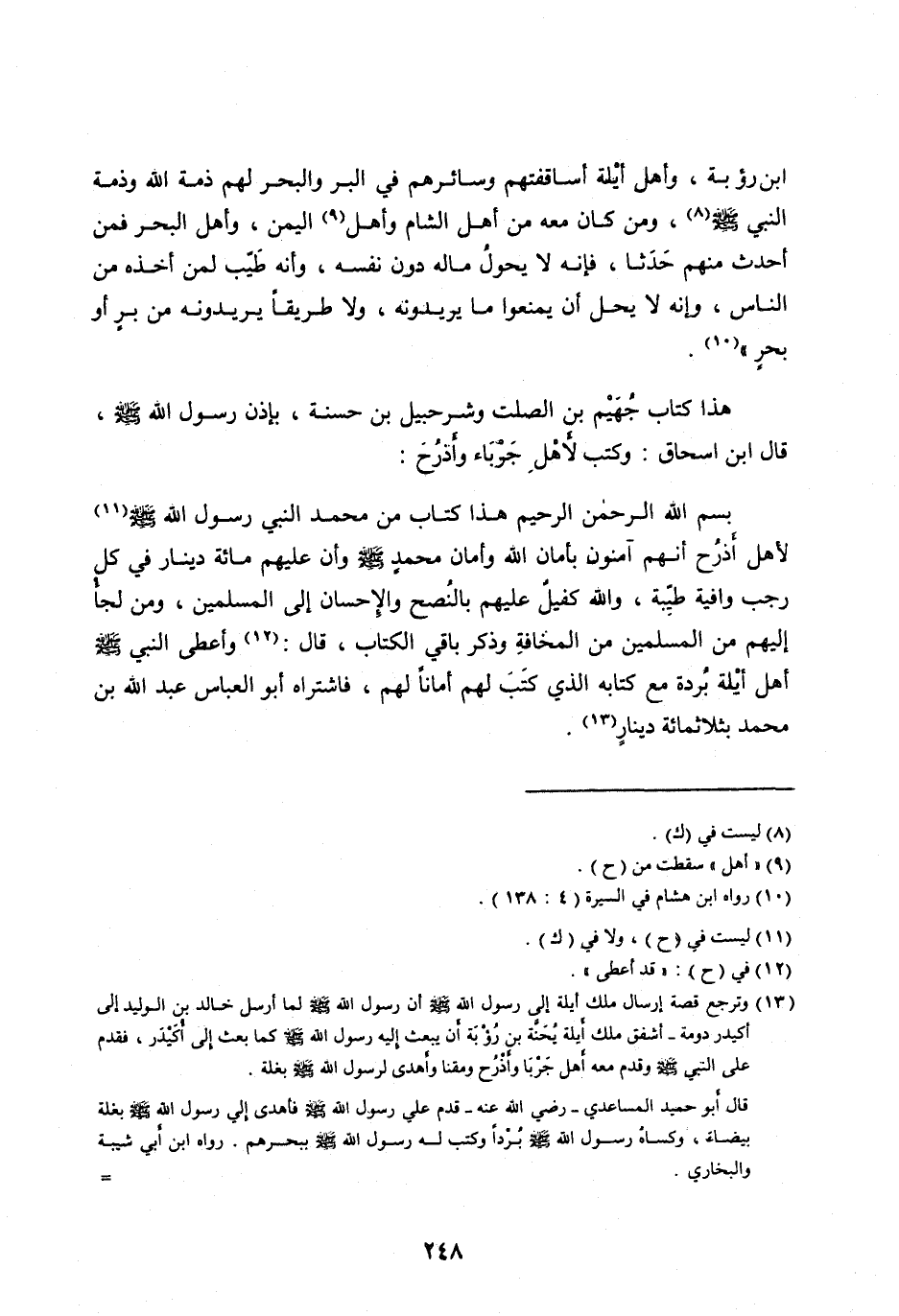 بِسْمِ اللهِ الرَّحْمَنِ الرَّحِيمِ هَذَا كِتَابٌ مِنْ مُحَمَّدٍ النَّبِيِّ رسول الله صلى الله عَلَيْهِ وَسَلَّمَ [ (11) ] لِأَهْلِ أَذْرُحَ أَنَّهُمْ آمِنُونَ بِأَمَانِ اللهِ وَأَمَانِ مُحَمَّدٍ صَلَّى اللهُ عَلَيْهِ وَسَلَّمَ وَأَنَّ عَلَيْهِمْ مِائَةَ دِينَارٍ فِي كُلِّ رَجَبٍ وَافِيَةً طَيْبَةً، وَاللهُ كَفِيلٌ عَلَيْهِمْ بِالنُّصْحِ وَالْإِحْسَانِ إِلَى الْمُسْلِمِينَ، وَمَنْ لَجَأَ إِلَيْهِمْ مِنَ الْمُسْلِمِينَ مِنَ الْمَخَافَةِ وَذَكَرَ بَاقِيَ الْكِتَابِ، قَالَ: [ (12) ] وَأَعْطَى النَّبِيُّ صَلَّى الله عليه وسلم أَهْلَ أَيْلَةَ بُرْدَةً مَعَ كِتَابِهِ الَّذِي كَتَبَ لَهُمْ أَمَانًا لَهُمْ، فَاشْتَرَاهُ أَبُو الْعَبَّاسِ عَبْدُ اللهِ بْنُ محمد بثلاثمائة دينار [ (13) ] .