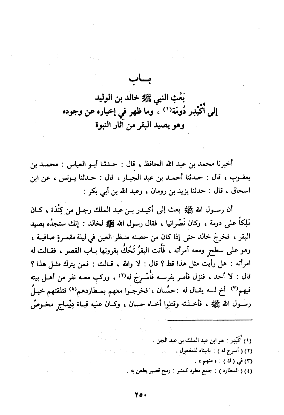 أَنَّ رَسُولَ اللهِ صَلَّى اللهُ عَلَيْهِ وَسَلَّمَ بَعَثَ إِلَى أُكَيْدِرَ بْنِ عَبْدِ الْمَلِكِ رَجُلٌ مِنْ كِنْدَةَ، كَانَ مَلِكًا عَلَى دُومَةَ، وَكَانَ نَصْرَانِيًّا، فَقَالَ رَسُولُ اللهِ صَلَّى اللهُ عَلَيْهِ وَسَلَّمَ لِخَالِدٍ: إِنَّكَ سَتَجِدُهُ يَصِيدُ الْبَقَرَ، فَخَرَجَ خَالِدٌ حَتَّى إِذَا كَانَ مِنْ حِصْنِهِ مَنْظَرَ الْعَيْنِ فِي لَيْلَةٍ مُقْمِرَةٍ صَافِيَةٍ، وَهُوَ عَلَى سَطْحٍ وَمَعَهُ امْرَأَتُهُ، فَأَتَتِ الْبَقَرُ تَحُكُّ بِقُرُونِهَا بَابَ الْقَصْرِ، فَقَالَتْ لَهُ امْرَأَتُهُ: هَلْ رَأَيْتَ مِثْلَ هَذَا قَطُّ؟ قَالَ: لَا وَاللهِ، قَالَتْ: فَمَنْ يَتْرُكُ مِثْلَ هَذَا؟