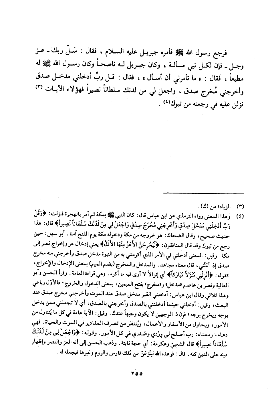 فَرَجَعَ رَسُولُ اللهِ صَلَّى اللهُ عَلَيْهِ وَسَلَّمَ فَأَمَرَهُ جِبْرِيلُ عَلَيْهِ السَّلَامُ، فَقَالَ: سَلْ رَبَّكَ- عَزَّ وَجَلَّ- فَإِنَّ لِكُلِّ نَبِيٍّ مَسْأَلَةً، وَكَانَ جِبْرِيلُ لَهُ نَاصِحًا وَكَانَ رَسُولُ اللهِ صَلَّى اللهُ عَلَيْهِ وَسَلَّمَ لَهُ مُطِيعًا، فَقَالَ: «مَا تَأْمُرُنِي أَنْ أَسْأَلَ» ، فَقَالَ: قُلْ رَبِّ أَدْخِلْنِي مُدْخَلَ صِدْقٍ وَأَخْرِجْنِي مُخْرَجَ صِدْقٍ، وَاجْعَلْ لِي مِنْ لَدُنْكَ سُلْطَانًا نصيرا فَهَؤُلَاءِ الْآيَاتُ [ (3) ] نَزَلْنَ عَلَيْهِ فِي رَجَعْتِهِ مِنْ تَبُوكَ [ (4) ] .