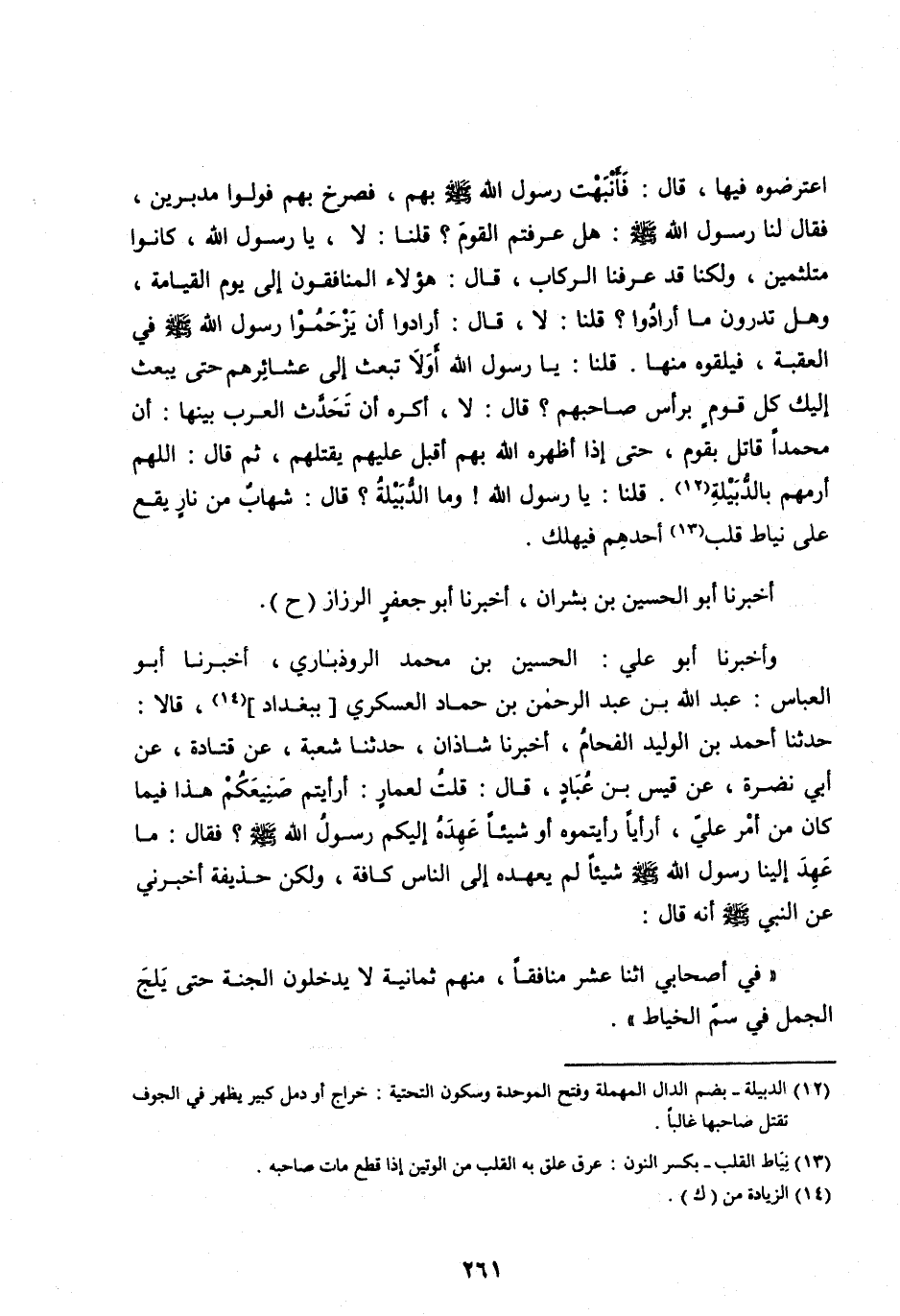 اعْتَرَضُوهُ فِيهَا، قَالَ: فَأَنْبَهْتُ رَسُولَ اللهِ صَلَّى الله عَلَيْهِ وَسَلَّمَ بِهِمْ، فَصَرَخَ بِهِمْ فَوَلَّوْا مُدْبِرِينَ، فَقَالَ لَنَا رَسُولُ اللهِ صَلَّى اللهُ عَلَيْهِ وَسَلَّمَ: هَلْ عَرَفْتُمُ الْقَوْمَ؟ قُلْنَا: لَا، يَا رَسُولَ اللهِ، كَانُوا مُتَلَثِّمِينَ، وَلَكِنَّا قَدْ عَرَفْنَا الرِّكَابَ، قَالَ: هَؤُلَاءِ الْمُنَافِقُونَ إِلَى يَوْمِ الْقِيَامَةِ، وَهَلْ تَدْرُونَ مَا أَرَادُوا؟ قُلْنَا: لَا، قَالَ: أَرَادُوا أَنْ يَزْحَمُوا رَسُولَ اللهِ صَلَّى اللهُ عَلَيْهِ وَسَلَّمَ فِي الْعَقَبَةِ، فَيُلْقُوهُ مِنْهَا. قُلْنَا: يَا رَسُولَ اللهِ أَوَلَا تَبْعَثُ إِلَى عَشَائِرِهِمْ حَتَّى يَبْعَثَ إِلَيْكَ كُلُّ قَوْمٍ بِرَأْسِ صَاحِبِهِمْ؟ قَالَ: لَا، أَكْرَهُ أَنْ تَحَدَّثَ الْعَرَبُ بَيْنَهَا: أَنَّ مُحَمَّدًا قَاتَلَ بِقَوْمٍ، حَتَّى إِذَا أَظْهَرَهُ اللهُ بِهِمْ أَقْبَلَ عَلَيْهِمْ يَقْتُلُهُمْ، ثُمَّ قَالَ: اللهُمَّ ارْمِهِمْ بِالدُّبَيْلَةِ [ (12) ] . قُلْنَا: يَا رَسُولَ اللهِ! وَمَا الدُّبَيْلَةُ؟ قَالَ: شِهَابٌ مِنْ نَارٍ يَقَعُ عَلَى نِيَاطِ قَلْبِ [ (13) ] أَحَدِهِمْ فَيَهْلِكُ.