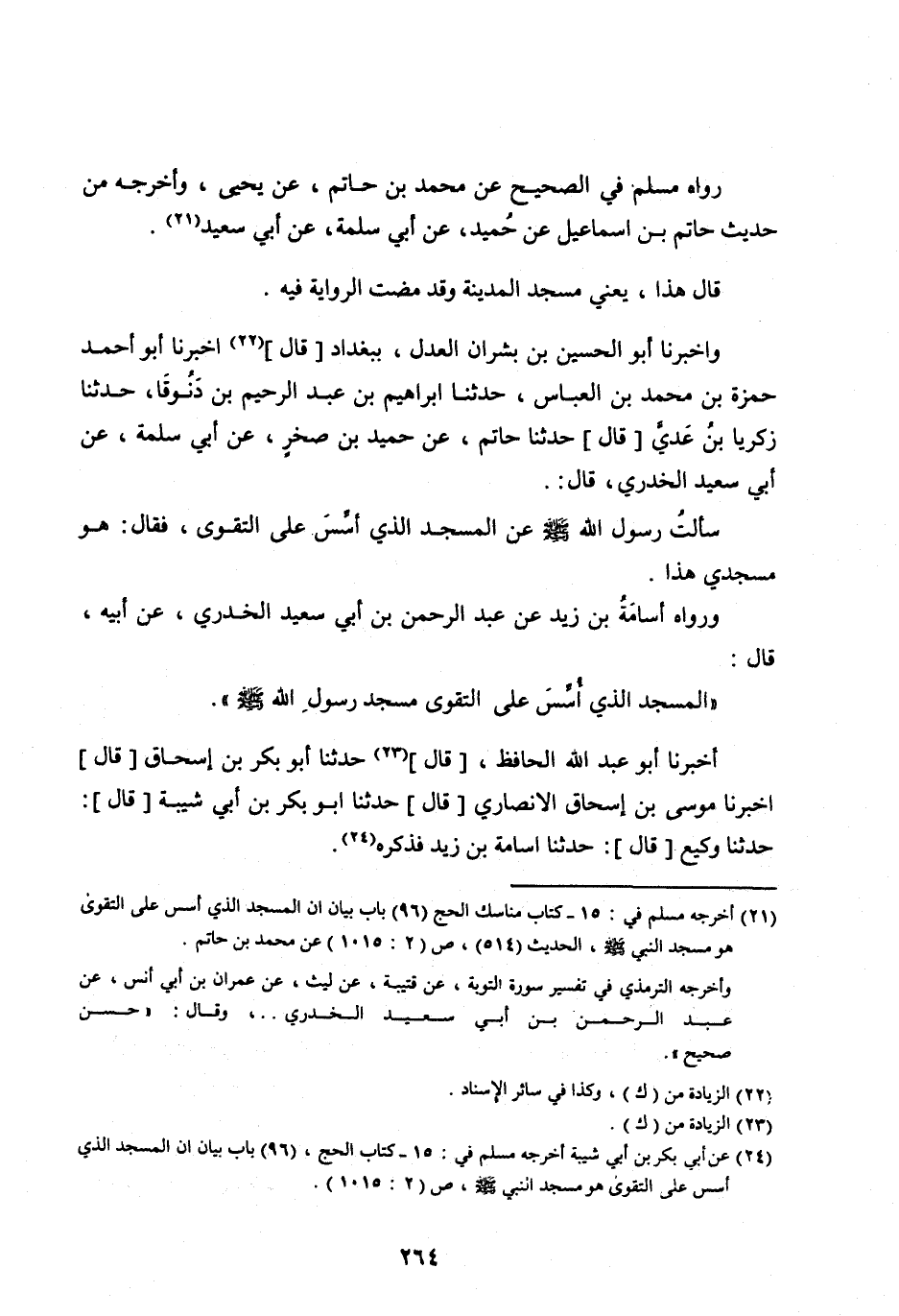 [ (21) ] أخرجه مسلم في: 15- كتاب مناسك الحج (96) باب بيان إِنَّ الْمَسْجِدَ الَّذِي أُسِّسَ عَلَى التَّقْوَى هُوَ مَسْجِدُ النبي صلى الله عليه وسلم، الحديث (514) ، ص (2: 1015) عَنْ مُحَمَّدِ بْنِ حَاتِمٍ.