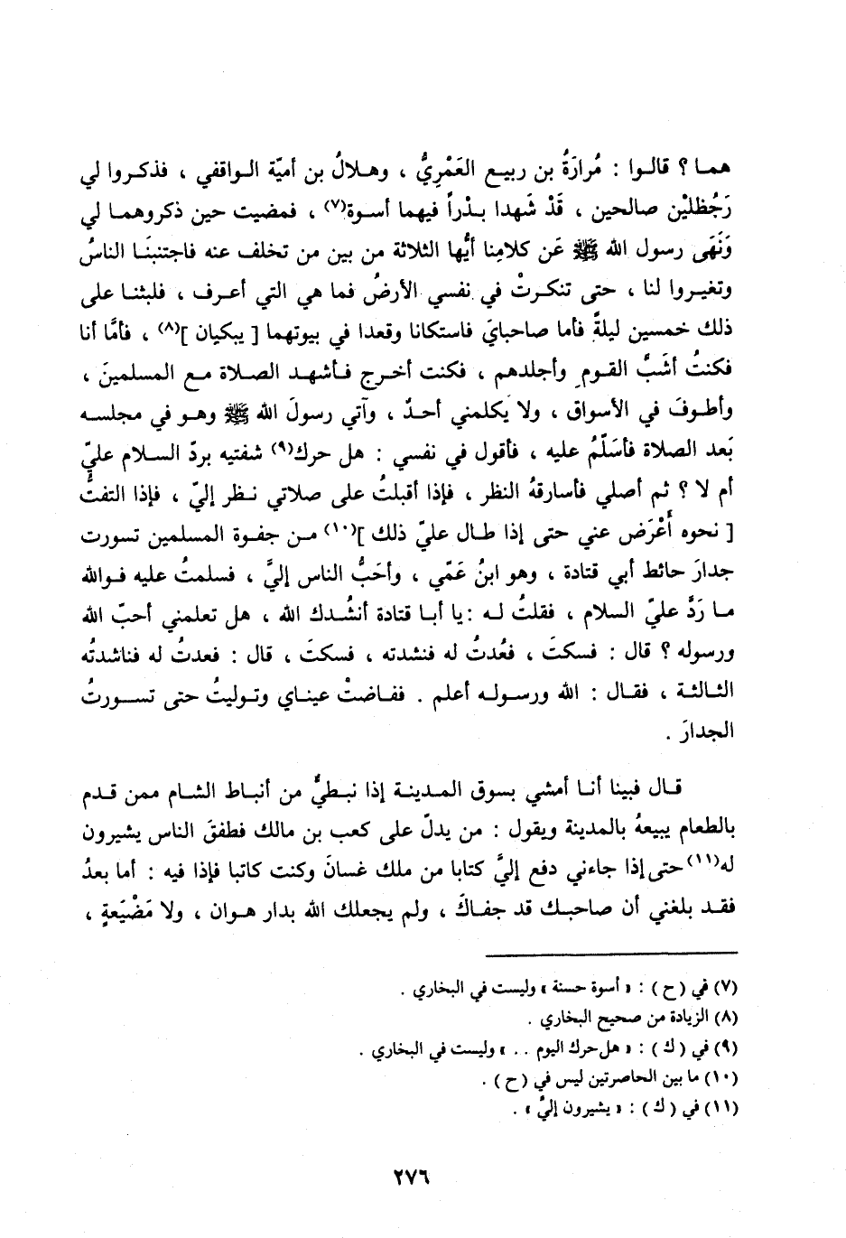 هُمَا؟ قَالُوا: مُرَارَةُ بْنُ رَبِيعٍ الْعَمْرِيُّ، وَهِلَالُ بْنُ أُمَيَّةَ الْوَاقِفِيُّ، فَذَكَرُوا لِي رجظلين صَالِحَيْنِ، قَدْ شَهِدَا بَدْرًا فِيهِمَا أُسْوَةٌ [ (7) ] ، فَمَضَيْتُ حِينَ ذَكَرُوهُمَا لِي وَنَهَى رَسُولُ الله صلى الله عليه وَسَلَّمَ عَنْ كَلَامِنَا أَيُّهَا الثَّلَاثَةُ مِنْ بَيْنِ مَنْ تَخَلَّفَ عَنْهُ فَاجْتَنَبَنَا النَّاسُ وَتَغَيَّرُوا لَنَا، حَتَّى تَنَكَّرَتْ فِي نَفْسِي الْأَرْضُ فَمَا هِيَ الَّتِي أَعْرِفُ، فَلَبِثْنَا عَلَى ذَلِكَ خَمْسِينَ لَيْلَةً فَأَمَّا صَاحِبَايَ فَاسْتَكَانَا وَقَعَدَا فِي بُيُوتِهِمَا [يَبْكِيَانِ] [ (8) ] ، فَأَمَّا أَنَا فَكُنْتُ أَشَبَّ الْقَوْمِ وَأَجْلَدَهُمْ، فَكُنْتُ أَخْرُجُ فَأَشْهَدُ الصَّلَاةَ مَعَ الْمُسْلِمِينَ، وَأَطُوفُ فِي الْأَسْوَاقِ، وَلَا يكَلِّمُنِي أَحَدٌ، وَأَتَى رَسُولَ اللهِ صَلَّى اللهُ عَلَيْهِ وَسَلَّمَ وَهُوَ فِي مَجْلِسِهِ بَعْدَ الصَّلَاةِ فَأُسَلِّمُ عَلَيْهِ، فَأَقُولُ فِي نَفْسِي: هَلْ حَرَّكَ [ (9) ] شَفَتَيْهِ بِرَدِّ السَّلَامِ عَلَيَّ أَمْ لَا؟ ثُمَّ أُصَلَّى فَأُسَارِقُهُ النَّظَرَ، فَإِذَا أَقْبَلْتُ عَلَى صَلَاتِي نَظَرَ إِلَيَّ، فَإِذَا الْتَفَتُّ [نَحْوَهُ أَعْرَضَ عَنِّي حَتَّى إِذَا طَالَ عَلَيَّ ذَلِكَ] [ (10) ] مِنْ جَفْوَةِ الْمُسْلِمِينَ تَسَوَّرْتُ جِدَارَ حَائِطِ أَبِي قَتَادَةَ، وَهُوَ ابْنُ عَمِّي، وَأَحَبُّ النَّاسِ إِلَيَّ، فسلمت عليه فو الله مَا رَدَّ عَلَيَّ السَّلَامَ، فَقُلْتُ لَهُ: يَا أَبَا قَتَادَةَ أَنْشُدُكَ اللهَ، هَلْ تَعْلَمُنِي أُحِبُّ اللهَ وَرَسُولَهُ؟ قَالَ: فَسَكَتَ، فَعُدْتُ لَهُ فَنَشَدْتُهُ، فَسَكَتَ، قَالَ: فَعُدْتُ لَهُ فَنَاشَدْتُهُ الثَّالِثَةَ، فَقَالَ: اللهُ وَرَسُولُهُ أَعْلَمُ. فَفَاضَتْ عَيْنَايَ وَتَوَلَّيْتُ حَتَّى تَسَوَّرْتُ الْجِدَارَ.