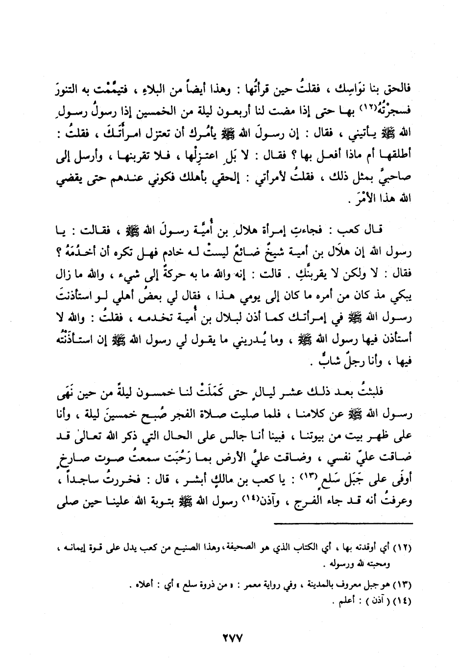 فَلَبِثْتُ بَعْدَ ذَلِكَ عَشْرَ لَيَالٍ حَتَّى كَمَلَتْ لَنَا خَمْسُونَ لَيْلَةً مِنْ حِينَ نَهَى رَسُولُ اللهِ صَلَّى الله عَلَيْهِ وَسَلَّمَ عَنْ كَلَامِنَا، فَلَمَّا صَلَّيْتُ صَلَاةَ الْفَجْرِ صُبْحَ خَمْسِينَ لَيْلَةً، وَأَنَا عَلَى ظَهْرِ بَيْتٍ مِنْ بُيُوتِنَا، فَبَيْنَا أَنَا جَالِسٌ عَلَى الْحَالِ الَّتِي ذَكَرَ اللهُ تَعَالَى قَدْ ضَاقَتْ عَلَيَّ نَفْسِي، وَضَاقَتْ عَلَيَّ الْأَرْضُ بِمَا رَحُبَتْ سَمِعْتُ صَوْتَ صَارِخٍ أَوْفَى عَلَى جَبَلِ سَلْعٍ [ (13) ] : يَا كَعْبَ بْنَ مَالِكٍ أَبْشِرْ، قَالَ: فَخَرَرْتُ سَاجِدًا، وَعَرَفْتُ أَنَّهُ قَدْ جَاءَ الْفَرَجُ، وَآذَنَ [ (14) ] رسول الله صلى الله عَلَيْهِ وَسَلَّمَ بِتَوْبَةِ اللهِ علينا حين صلّى