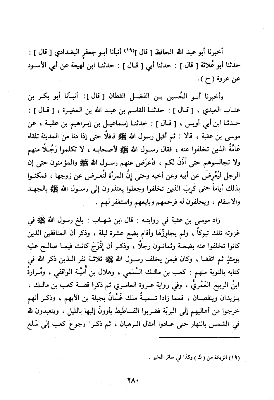 زَادَ مُوسَى بْنُ عُقْبَةَ فِي رِوَايَتِهِ: قَالَ ابْنُ شِهَابٍ: بَلَغَ رَسُولُ اللهِ صَلَّى اللهُ عَلَيْهِ وَسَلَّمَ فِي غزوته تلك تبوكا، وَلَمْ يُجَاوِزْهَا وَأَقَامَ بِضْعَ عَشْرَةَ لَيْلَةً، وَذَكَرَ أَنَّ الْمُنَافِقِينَ الَّذِينَ كَانُوا تَخَلَّفُوا عَنْهُ بِضْعَةٌ وَثَمَانُونَ رَجُلًا، وَذَكَرَ أَنَّ إِذْرَجَ كَانَتْ فِيمَا صَالَحَ عَلَيْهِ يَوْمَئِذٍ ثُمَّ اتَّفَقَا، وَكَانَ فِيمَنْ يخلف رسول الله صلى الله عَلَيْهِ وَسَلَّمَ ثَلَاثَةُ نَفَرٍ الَّذِينَ ذَكَرَ اللهُ فِي كِتَابِهِ بِالتَّوْبَةِ مِنْهُمْ: كَعْبُ بْنُ مَالِكٍ السُّلَمِيُّ، وَهِلَالُ بْنُ أُمَيَّةَ الْوَاقِفِيُّ، وَمُرَارَةُ ابن الرَّبِيعِ الْعَمْرِيُّ، وَفِي رِوَايَةِ عُرْوَةَ الْعَامِرِيُّ ثُمَّ ذَكَرَا قِصَّةَ كَعْبِ بْنِ مَالِكٍ، يزيدان وينقصان، فمما زادا تَسْمِيَةُ مَلِكِ غَسَّانَ بِجَبَلَةَ بْنِ الْأَيْهَمِ، وَذَكَرَ أَنَّهُمْ خَرَجُوا مِنْ أَهَالِيهِمْ إِلَى الْبَرِيَّةِ فَضَرَبُوا الْفَسَاطِيطَ يَأْوُونَ إِلَيْهَا بِاللَّيْلِ، وَيَتَعَبَّدُونَ لِلَّهِ فِي الشَّمْسِ بِالنَّهَارِ حَتَّى عَادُوا أَمْثَالَ الرُّهْبَانِ، ثُمَّ ذكرا رُجُوعِ كَعْبٍ إِلَى سَلْعٍ
