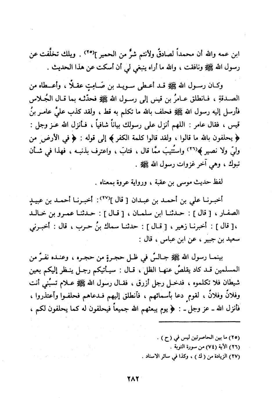 ابْنُ عَمِّهِ وَاللهِ إِنَّ مُحَمَّدًا لَصَادِقٌ وَلَأَنْتُمْ شَرٌّ مِنَ الْحَمِيرِ] [ (25) ] . وَيْلَكَ تَخَلَّفْتَ عَنْ رَسُولِ اللهِ صَلَّى اللهُ عَلَيْهِ وَسَلَّمَ وَنَافَقْتَ، وَاللهِ مَا أَرَاهُ يَنْبَغِي لِي أَنْ أَسْكُتَ عَنْ هَذَا الْحَدِيثِ.