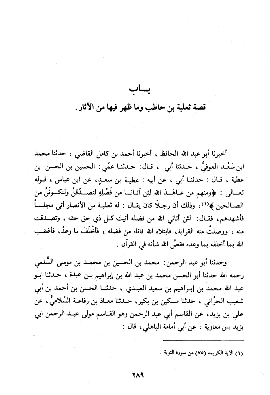 أَخْبَرَنَا أَبُو عَبْدِ اللهِ الْحَافِظُ، أَخْبَرَنَا أَحْمَدُ بْنُ كَامِلٍ الْقَاضِي، حَدَّثَنَا محمد ابن سَعْدٍ الْعَوْفِيُّ، حَدَّثَنَا أَبِي، قَالَ: حَدَّثَنَا عَمِّي: الْحُسَيْنُ بْنُ الْحَسَنِ بْنِ عَطِيَّةَ، قَالَ: حَدَّثَنَا أَبِي، عَنْ أَبِيهِ: عَطِيَّةَ بْنِ سَعْدِ، عَنِ ابْنِ عَبَّاسٍ، قَوْلُهُ تَعَالَى: وَمِنْهُمْ مَنْ عاهَدَ اللَّهَ لَئِنْ آتَانَا مِنْ فَضْلِهِ لَنَصَّدَّقَنَّ وَلَنَكُونَنَّ مِنَ الصَّالِحِينَ [ (1) ] ، وَذَلِكَ أَنَّ رَجُلًا كَانَ يُقَالُ: لَهُ ثَعْلَبَةُ مِنَ الأنصار أتى مجلسه فَأَشْهَدَهُمْ، فَقَالَ: لَئِنْ آتَانِي اللهُ مِنْ فَضْلِهِ آتَيْتُ كُلِّ ذِي حَقٍّ حَقَّهُ، وتصدقه مِنْهُ، وَوَصَلْتُ مِنْهُ الْقَرَابَةَ، فَابْتَلَاهُ اللهُ فَآتَاهُ مِنْ فَضْلِهِ، فَأَخْلَفَ مَا وَعَدَ، فَأَغْضَبَ اللهَ بِمَا أَخْلَفَهُ بِمَا وَعْدَهُ فَقَصَّ اللهُ شَأْنَهُ فِي الْقُرْآنِ.