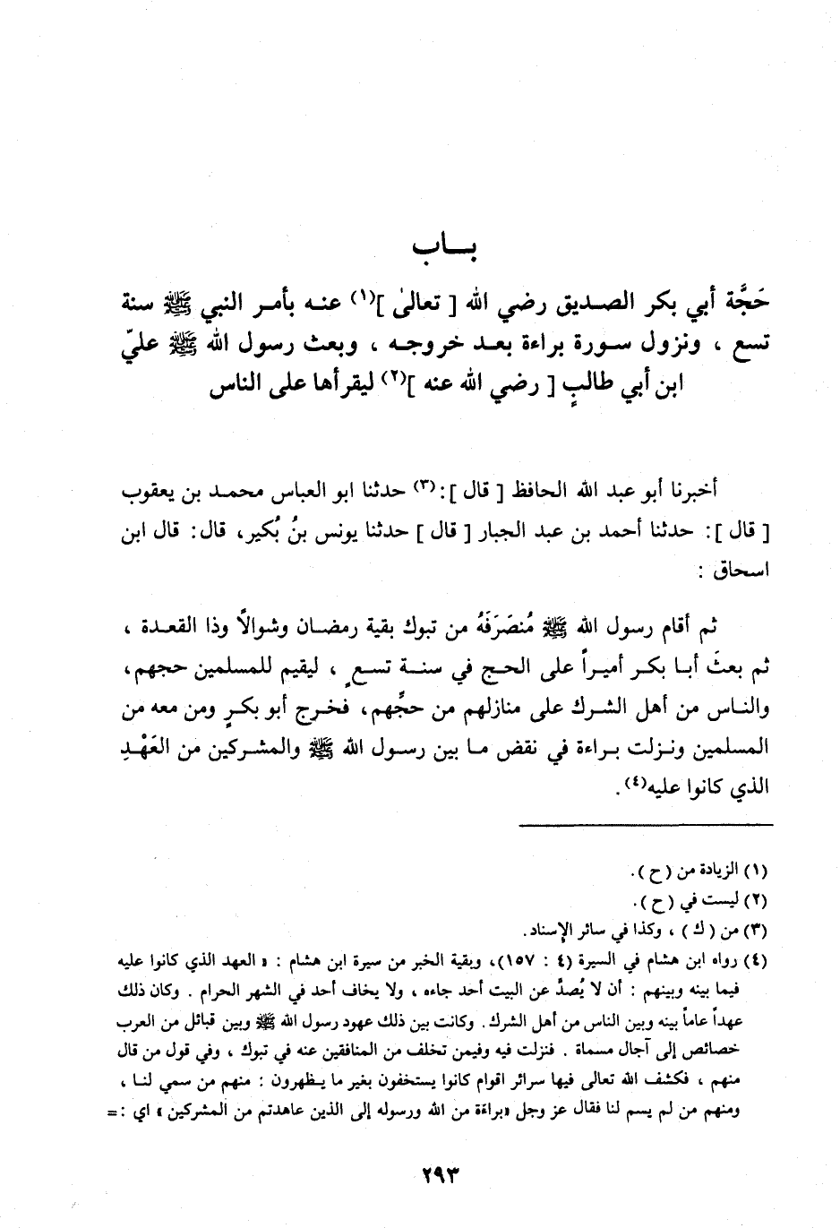 ثُمَّ أَقَامَ رَسُولُ اللهِ صَلَّى اللهُ عَلَيْهِ وَسَلَّمَ مُنْصَرَفَهُ مِنْ تَبُوكَ بَقِيَّةَ رَمَضَانَ وَشَوَّالًا وَذَا الْقَعْدَةِ، ثُمَّ بَعَثَ أَبَا بَكْرٍ أَمِيرًا عَلَى الْحَجِّ فِي سَنَةِ تِسْعٍ، لِيُقِيمَ لِلْمُسْلِمِينَ حَجَّهُمْ، وَالنَّاسُ مِنْ أَهْلِ الشِّرْكِ عَلَى مَنَازِلِهِمْ مِنْ حَجِّهِمْ، فَخَرَجَ أَبُو بَكْرٍ وَمَنْ مَعَهُ مِنَ الْمُسْلِمِينَ وَنَزَلَتْ بَرَاءَةُ فِي نَقْضِ مَا بَيْنَ رَسُولِ اللهِ صَلَّى اللهُ عَلَيْهِ وَسَلَّمَ وَالْمُشْرِكِينَ مِنَ الْعَهْدِ الَّذِي كَانُوا عليه [ (4) ] .