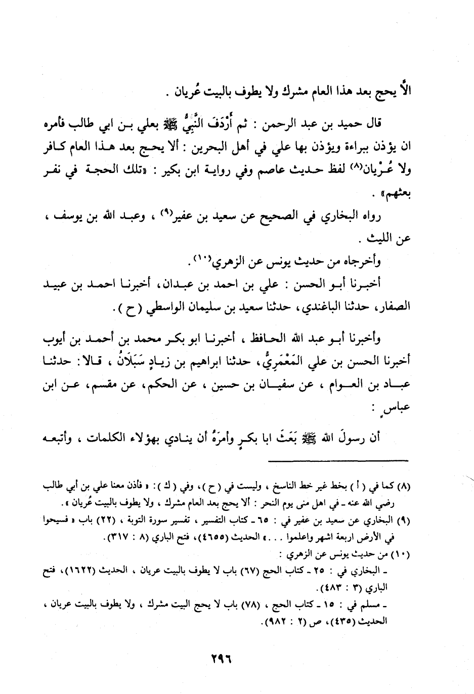 قَالَ حُمَيْدُ بْنُ عَبْدِ الرَّحْمَنِ: ثُمَّ أَرْدَفَ النَّبِيُّ صَلَّى اللهُ عَلَيْهِ وَسَلَّمَ بِعَلِيِّ بْنِ أَبِي طَالِبٍ فَأَمَرَهُ أَنْ يُؤَذِّنَ بِبَرَاءَةَ وَيؤَذِّنَ بِهَا عَلِيٌّ فِي أَهْلِ الْبَحْرَيْنِ: أَلَّا يَحُجَّ بَعْدَ هَذَا الْعَامِ كَافِرٌ وَلَا عُرْيَانٌ [ (8) ] لَفْظُ حَدِيثِ عَاصِمٍ وَفِي رِوَايَةِ ابْنِ بُكَيْرٍ: «تِلْكَ الْحَجَّةُ فِي نَفَرٍ بَعَثَهُمْ» .
