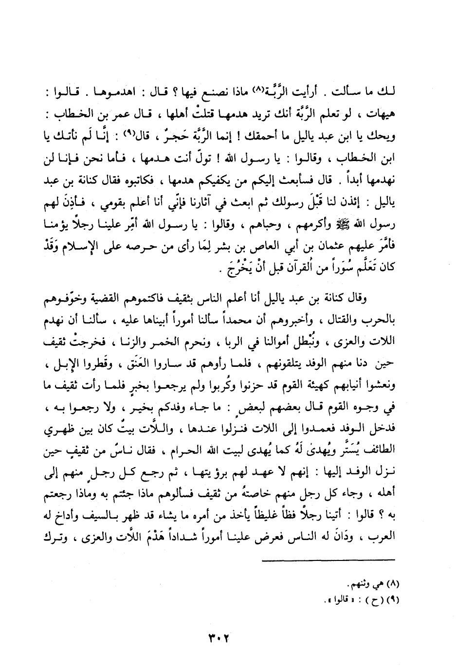 وَيْحَكَ يَا ابْنَ عَبْدِ يَالِيلَ مَا أَحْمَقَكَ! إِنَّمَا الرَّبَّةُ حَجَرٌ، قَالَ [ (9) ] : إِنَّا لَمْ نَأْتِكَ يَا ابْنَ الْخَطَّابِ، وَقَالُوا: يَا رَسُولَ اللهِ! تَوَلَّ أَنْتَ هَدْمَهَا، فَأَمَّا نَحْنُ فَإِنَّا لَنْ نَهْدِمَهَا أَبَدًا. قَالَ فَسَأَبْعَثُ إِلَيْكُمْ مَنْ يَكْفِيكُمْ هَدْمَهَا، فَكَاتَبُوهُ فَقَالَ كِنَانَةُ بْنُ عَبْدِ يَالِيلَ: ائْذَنْ لَنَا قَبْلَ رَسُولِكَ ثُمَّ ابْعَثْ فِي آثَارِنَا فَإِنِّي أَنَا أَعْلَمُ بِقَوْمِي، فَأَذِنَ لَهُمْ رَسُولُ اللهِ صَلَّى اللهُ عَلَيْهِ وَسَلَّمَ وَأَكْرَمُهُمْ، وَحَبَاهُمْ، وَقَالُوا: يَا رَسُولَ اللهِ أَمِّرْ عَلَيْنَا رَجُلًا يَؤُمُّنَا فَأَمَّرَ عَلَيْهِمْ عُثْمَانَ بْنَ أَبِي الْعَاصِ بْنِ بِشْرٍ لِمَا رَأَى مِنْ حِرْصِهِ عَلَى الْإِسْلَامِ وَقَدْ كَانَ تَعَلَّمَ سُوَرًا مِنَ الْقُرْآنِ قَبْلَ أَنْ يَخْرُجَ.