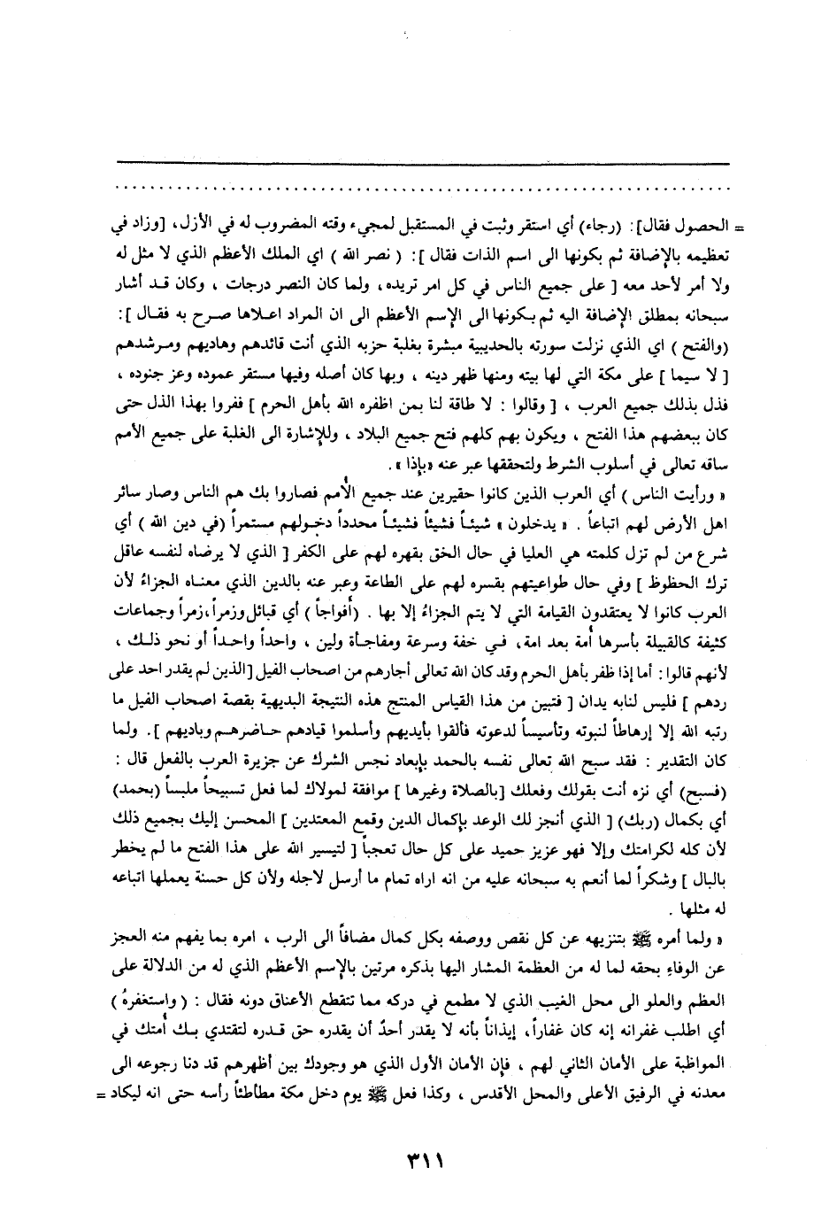 «ولما أمره صلّى الله عليه وسلم بتنزيهه عن كل نقص ووصفه بكل كمال مضافا الى الرب، امره بما يفهم منه العجز عن الوفاء بحقه لما له من العظمة المشار إليها بذكره مرتين بالاسم الأعظم الذي له من الدلالة على العظم والعلو الى محل الغيب الذي لا مطمع في دركه مما تتقطع الأعناق دونه فقال: (واستغفره) أي اطلب غفرانه إنه كان غفارا، إيذانا بأنه لا يقدر أحد أن يقدره حق قدره لتقتدي بك أمتك في المواظبة على الأمان الثاني لهم، فإن الأمان الأول الذي هو وجودك بين أظهرهم قد دنا رجوعه الى معدنه في الرفيق الأعلى والمحل الأقدس، وكذا فعل صلّى الله عليه وسلم يوم دخل مكة مطأطئا رأسه حتى انه ليكاد
