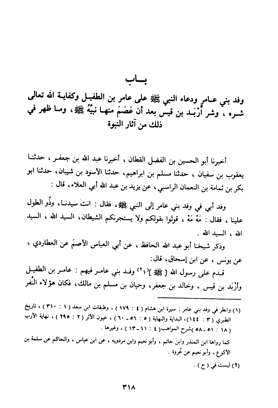 [ (1) ] وانظر فِي وَفْدِ بَنِي عَامِرٍ: سيرة ابن هشام (4: 179) ، وطبقات ابن سعد (1: 310) ، تاريخ الطبري (3: 144) ، البداية والنهاية (5: 56- 60) ، عيون الأثر (2: 295) ، نهاية الأرب (18: 51- 58) شرح المواهب (4: 11- 13) ، وغيرها.