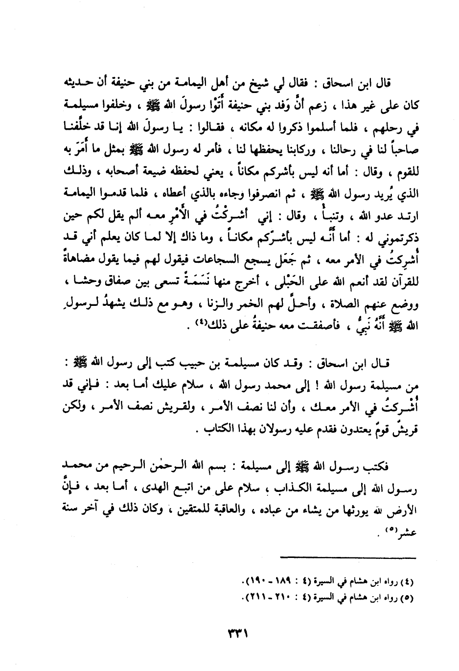 فَكَتَبَ رَسُولُ اللهِ صَلَّى اللهُ عَلَيْهِ وَسَلَّمَ إِلَى مُسَيْلِمَةَ: بِسْمِ اللهِ الرَّحْمَنِ الرَّحِيمِ مِنْ مُحَمَّدٍ رَسُولِ اللهِ إِلَى مُسَيْلِمَةَ الْكَذَّابِ، سَلَامٌ عَلَى مَنِ اتَّبَعَ الْهُدَى، أَمَّا بَعْدُ، فَإِنَّ الْأَرْضَ لِلَّهِ يَورِثُهَا مَنْ يَشَاءُ مِنْ عِبَادِهِ، وَالْعَاقِبَةُ لِلْمُتَّقِينَ، وَكَانَ ذَلِكَ فِي آخِرِ سَنَةِ عشر [ (5) ] .