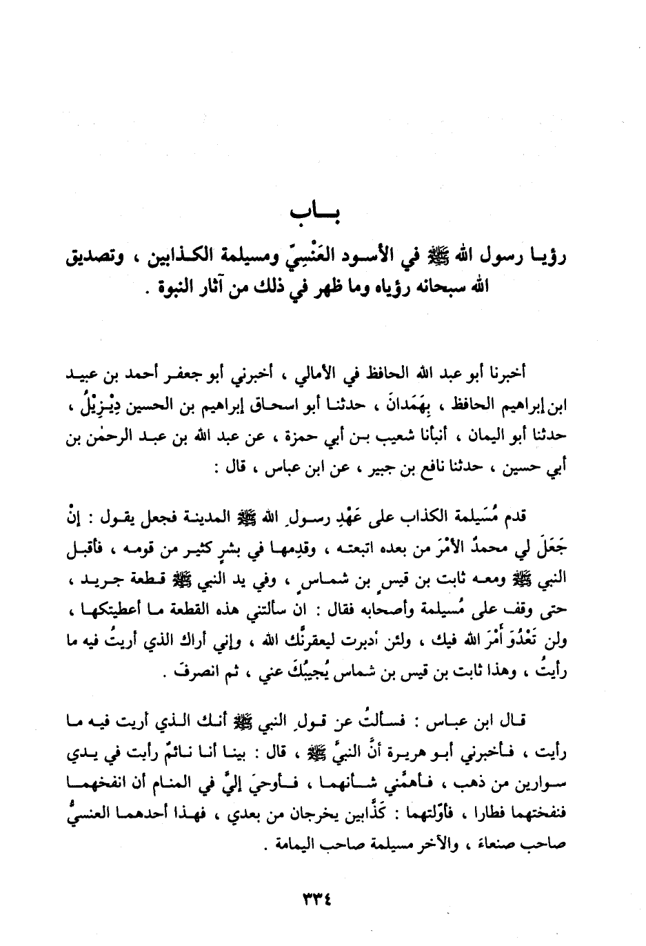 أَخْبَرَنَا أَبُو عَبْدِ اللهِ الْحَافِظُ فِي الْأَمَالِي، أَخْبَرَنِي أَبُو جَعْفَرٍ أَحْمَدُ بْنُ عبيد ابن إِبْرَاهِيمَ الْحَافِظُ، بِهَمْدَانَ، حَدَّثَنَا أَبُو إِسْحَاقَ إِبْرَاهِيمُ بْنُ الْحُسَيْنِ دِيزِيلُ، حَدَّثَنَا أَبُو الْيَمَانِ، أَنْبَأَنَا شُعَيْبُ بْنُ أَبِي حَمْزَةَ، عَنْ عَبْدِ اللهِ بْنِ عَبْدِ الرَّحْمَنِ بْنِ أَبِي حُسَيْنٍ، حَدَّثَنَا نَافِعُ بْنِ جُبَيْرٍ، عَنِ ابْنِ عَبَّاسٍ، قَالَ: قَدِمَ مُسَيْلِمَةُ الْكَذَّابُ عَلَى عَهْدِ رَسُولِ اللهِ صَلَّى اللهُ عَلَيْهِ وَسَلَّمَ الْمَدِينَةَ فَجَعَلَ يَقُولُ: إِنْ جَعَلَ لِي مُحَمَّدٌ الْأَمْرَ مِنْ بَعْدِهِ اتَّبَعْتُهُ، وَقَدِمَهَا فِي بَشَرٍ كَثِيرٍ مِنْ قَوْمِهِ، فَأَقْبَلَ النَّبِيُّ صلى الله عليه وَسَلَّمَ وَمَعَهُ ثَابِتُ بْنُ قَيْسِ بْنِ شَمَّاسٍ، وَفِي يَدِ النَّبِيِّ صَلَّى اللهُ عَلَيْهِ وَسَلَّمَ قِطْعَةُ جَرِيدٍ، حَتَّى وَقَفَ عَلَى مُسَيْلِمَةَ وَأَصْحَابِهِ فَقَالَ: إِنْ سَأَلْتَنِي هَذِهِ الْقِطْعَةَ مَا أَعْطَيْتُكَهَا، وَلَنْ تَعْدُوَ أَمْرَ اللهِ فِيكَ، وَلَئِنْ أَدْبَرْتَ لَيَعْقِرَنَّكَ اللهُ، وَإِنِّي أَرَاكَ الَّذِي أُرِيتُ فِيهِ مَا رَأَيْتُ، وَهَذَا ثَابِتُ بْنُ قَيْسِ بْنِ شَمَّاسٍ يُجِيبُكَ عَنِّي، ثُمَّ انْصَرَفَ.