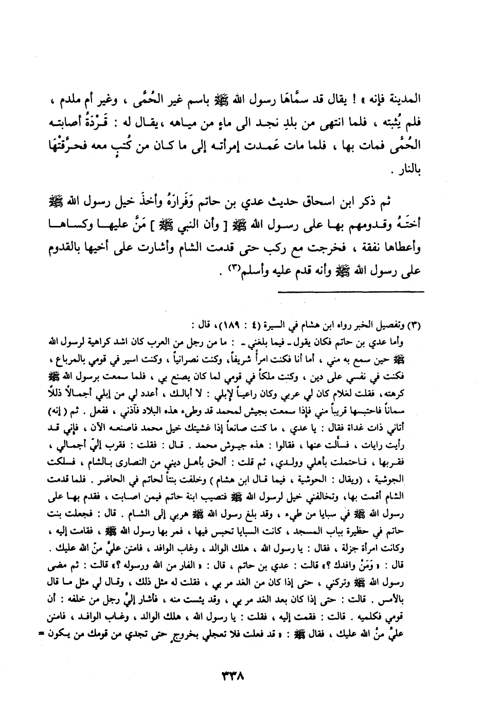 ثُمَّ ذَكَرَ ابْنُ إِسْحَاقَ حَدِيثَ عَدِيِّ بْنِ حَاتِمٍ وَفِرَارَهُ وَأَخْذَ خَيْلِ رَسُولِ اللهِ صلى الله عليه وسلم أُخْتَهُ وَقُدُومَهُمْ بِهَا عَلَى رَسُولِ اللهِ صَلَّى اللهُ عَلَيْهِ وَسَلَّمَ [وَأَنَّ النَّبِيَّ صَلَّى اللهُ عليه وسلم] مَنَّ عَلَيْهَا وَكَسَاهَا وَأَعْطَاهَا نَفَقَةً، فَخَرَجَتْ مَعَ رَكْبٍ حَتَّى قَدِمَتِ الشَّامَ وَأَشَارَتْ عَلَى أَخِيهَا بِالْقُدُومِ عَلَى رَسُولِ اللهِ صَلَّى الله عَلَيْهِ وَسَلَّمَ وَأَنَّهُ قَدِمَ عليه وأسلم [ (3) ] .
