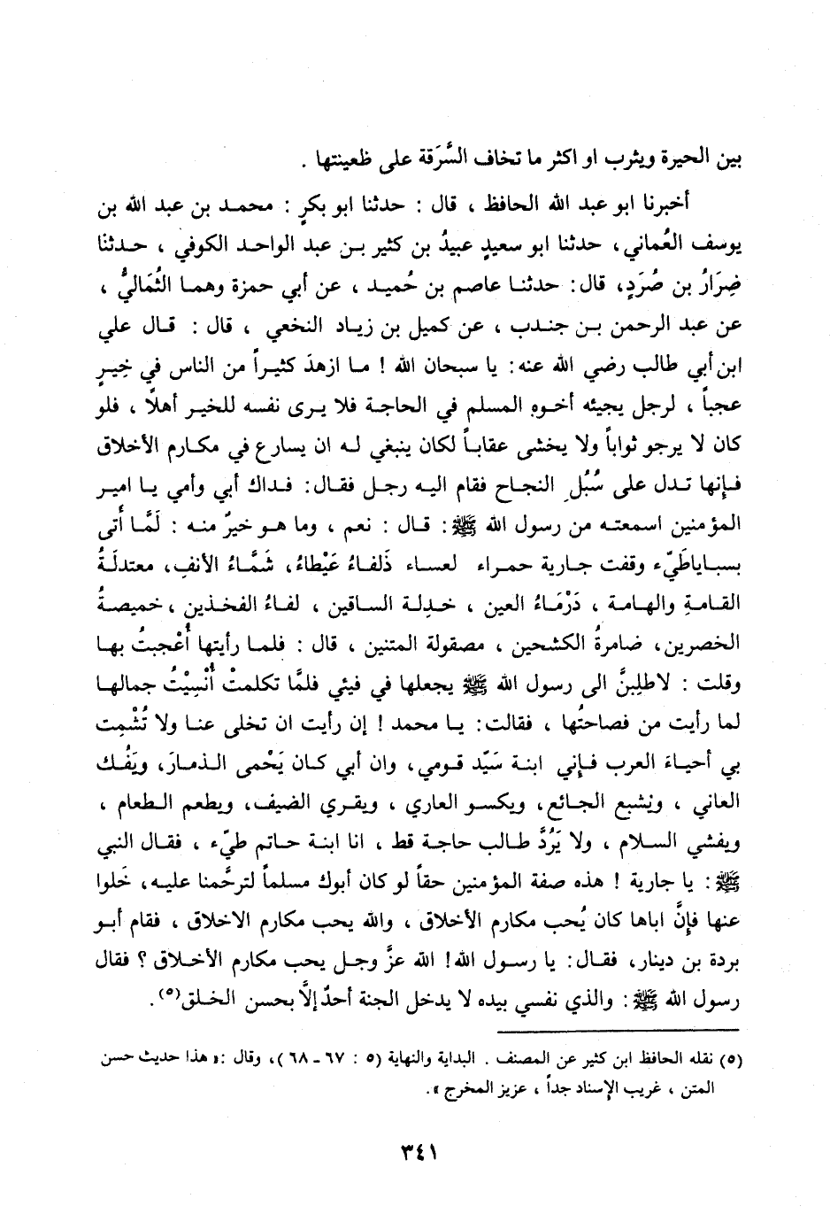 أَخْبَرَنَا أَبُو عَبْدِ اللهِ الْحَافِظُ، قَالَ: حَدَّثَنَا أَبُو بَكْرٍ: مُحَمَّدُ بْنُ عَبْدِ اللهِ بْنِ يُوسُفَ الْعُمَانِيُّ، حَدَّثَنَا أَبُو سَعِيدٍ عُبَيْدُ بْنُ كَثِيرِ بْنِ عَبْدِ الْوَاحِدِ الْكُوفِيُّ، حَدَّثَنَا ضِرَارُ بْنُ صُرَدَ، قَالَ: حَدَّثَنَا عَاصِمُ بْنُ حُمَيْدٍ، عَنْ أَبِي حَمْزَةَ وهما الثُّمَالِيُّ، عَنْ عَبْدِ الرَّحْمَنِ بْنِ جُنْدُبٍ، عَنْ كُمَيْلِ بْنِ زِيَادٍ النَّخَعِيِّ، قَالَ: قَالَ عَلِيُّ ابن أَبِي طَالِبٍ رَضِيَ اللهُ عَنْهُ: يَا سُبْحَانَ اللهِ! مَا أَزْهَدَ كَثِيرًا مِنَ النَّاسِ فِي خَيْرٍ عَجَبًا، لِرَجُلٍ يَجِيئُهُ أَخُوهُ الْمُسْلِمُ فِي الْحَاجَةِ فَلَا يَرَى نَفْسَهُ لِلْخَيْرِ أَهْلًا، فَلَوْ كَانَ لَا يَرْجُو ثَوَابًا وَلَا يَخْشَى عِقَابًا لَكَانَ يَنْبَغِي لَهُ أَنْ يسَارِعَ فِي مَكَارِمِ الْأَخْلَاقِ فَإِنَّهَا تَدُلُّ عَلَى سُبُلِ النجاحِ فَقَامَ إِلَيْهِ رَجُلٌ فَقَالَ: فِدَاكَ أَبِي وَأُمِّي يَا أَمِيرَ الْمُؤْمِنِينَ أَسَمِعْتَهُ مِنْ رَسُولِ اللهِ صَلَّى اللهُ عَلَيْهِ وَسَلَّمَ: قَالَ: نَعَمْ، وَمَا هُوَ خَيْرٌ مِنْهُ: لمّا أتى بسبايا طيّء وَقَفَتْ جَارِيَةٌ حَمْرَاءُ لَعْسَاءُ ذَلْفَاءُ عَيْطَاءُ، شَمَّاءُ الْأَنْفِ، مُعْتَدِلَةُ الْقَامَةِ وَالْهَامَةِ، دَرْمَاءُ الْعَيْنِ، خَدِلَةُ السَّاقَيْنِ، لَفَّاءُ الْفَخِذَيْنِ، خَمِيصَةُ الْخَصْرَيْنِ، ضَامِرَةُ الْكَشْحَيْنِ، مَصْقُولَةُ الْمَتْنَيْنِ، قَالَ: فَلَمَّا رَأَيْتُهَا أُعْجَبْتُ بِهَا وقلت: لا طلبنّ إِلَى رَسُولِ اللهِ صَلَّى اللهُ عَلَيْهِ وَسَلَّمَ يَجْعَلَهَا فِي فَيْئِي فَلَمَّا تَكَلَّمَتْ أُنْسِيتُ جَمَالَهَا لِمَا رَأَيْتُ مِنَ فَصَاحَتِهَا، فَقَالَتْ: يَا مُحَمَّدُ! إِنْ رَأَيْتَ أَنْ تُخَلِّىَ عَنَّا وَلَا تُشْمِتْ بِي أَحْيَاءَ الْعَرَبِ فَإِنِّي ابْنَةُ سَيِّدِ قَوْمِي، وَإِنَّ أَبِي كَانَ يَحْمِي الذِّمَارَ، وَيَفُكُّ الْعَانِي، وَيُشْبِعُ الْجَائِعَ، وَيَكْسُو الْعَارِي، وَيَقْرِي الضَّيْفَ، وَيُطْعِمُ الطَّعَامَ، وَيُفْشِي السَّلَامَ، وَلَا يَرُدُّ طَالِبَ حَاجَةٍ قَطُّ، أَنَا ابْنَةُ حَاتِمِ طيّء، فَقَالَ النَّبِيُّ صَلَّى اللهُ عَلَيْهِ وَسَلَّمَ: يَا جَارِيَةُ! هَذِهِ صِفَةُ الْمُؤْمِنِينَ حَقًّا لَوْ كَانَ أَبُوكِ مُسْلِمًا لَتَرَحَّمْنَا عَلَيْهِ، خَلُّوا عَنْهَا فَإِنَّ أَبَاهَا كَانَ يُحِبُّ مَكَارِمَ الْأَخْلَاقِ، وَاللهُ يُحِبُّ مَكَارِمَ الْأَخْلَاقِ، فَقَامَ أَبُو بُرْدَةَ بْنُ دينار، فَقَالَ: يَا رَسُولَ اللهِ! اللهُ عَزَّ وَجَلَّ يُحِبُّ مَكَارِمَ الْأَخْلَاقِ؟ فَقَالَ رَسُولُ اللهِ صَلَّى اللهُ عَلَيْهِ وَسَلَّمَ: وَالَّذِي نَفْسِي بِيَدِهِ لَا يَدْخُلُ الْجَنَّةَ أَحَدٌ إِلَّا بحسن الخلق [ (5) ] .