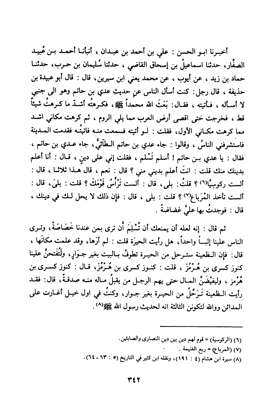 ثُمَّ قَالَ: إِنَّهُ لَعَلَّهُ أَنْ يَمْنَعَكَ أَنْ تُسْلِمَ أَنْ تَرَى بِمَنْ عِنْدَنَا خَصَاصَةً، وَتَرَى النَّاسَ عَلَيْنَا إِلْبًا وَاحِدًا، هَلْ رَأَيْتَ الْحِيرَةَ قُلْتُ: لَمْ أَرَهَا، وَقَدْ عَلِمْتُ مَكَانَهَا، قَالَ: فَإِنَّ الظَّعِينَةَ سَتَرْحَلُ مِنَ الْحِيرَةِ تَطُوفُ بِالْبَيْتِ بِغَيْرِ جِوَارٍ، وَلَتُفْتَحَنَّ عَلَيْنَا كُنُوزُ كِسْرَى بْنِ هُرْمُزَ، قُلْتُ: كُنُوزَ كِسْرَى بْنِ هُرْمُزَ، قَالَ: كُنُوزُ كِسْرَى بْنِ هُرْمُزَ، وَلَيَفِيضَنَّ الْمَالُ حَتَّى يَهُمَّ الرَّجُلُ مَنْ يَقْبَلُ مَالَهُ مِنْهُ صَدَقَةً، قَالَ: فَقَدْ رَأَيْتُ الظَّعِينَةَ تَرْحَلُ مِنَ الْحِيرَةِ بِغَيْرِ جِوَارٍ، وَكُنْتُ فِي أَوَّلِ خَيْلٍ أَغَارَتْ عَلَى الْمَدَائِنِ وو والله لَتَكُونَنَّ الثَّالِثَةَ إِنَّهُ لَحَدِيثُ رَسُولِ اللهِ صَلَّى اللهُ عَلَيْهِ وسلم [ (8) ] .