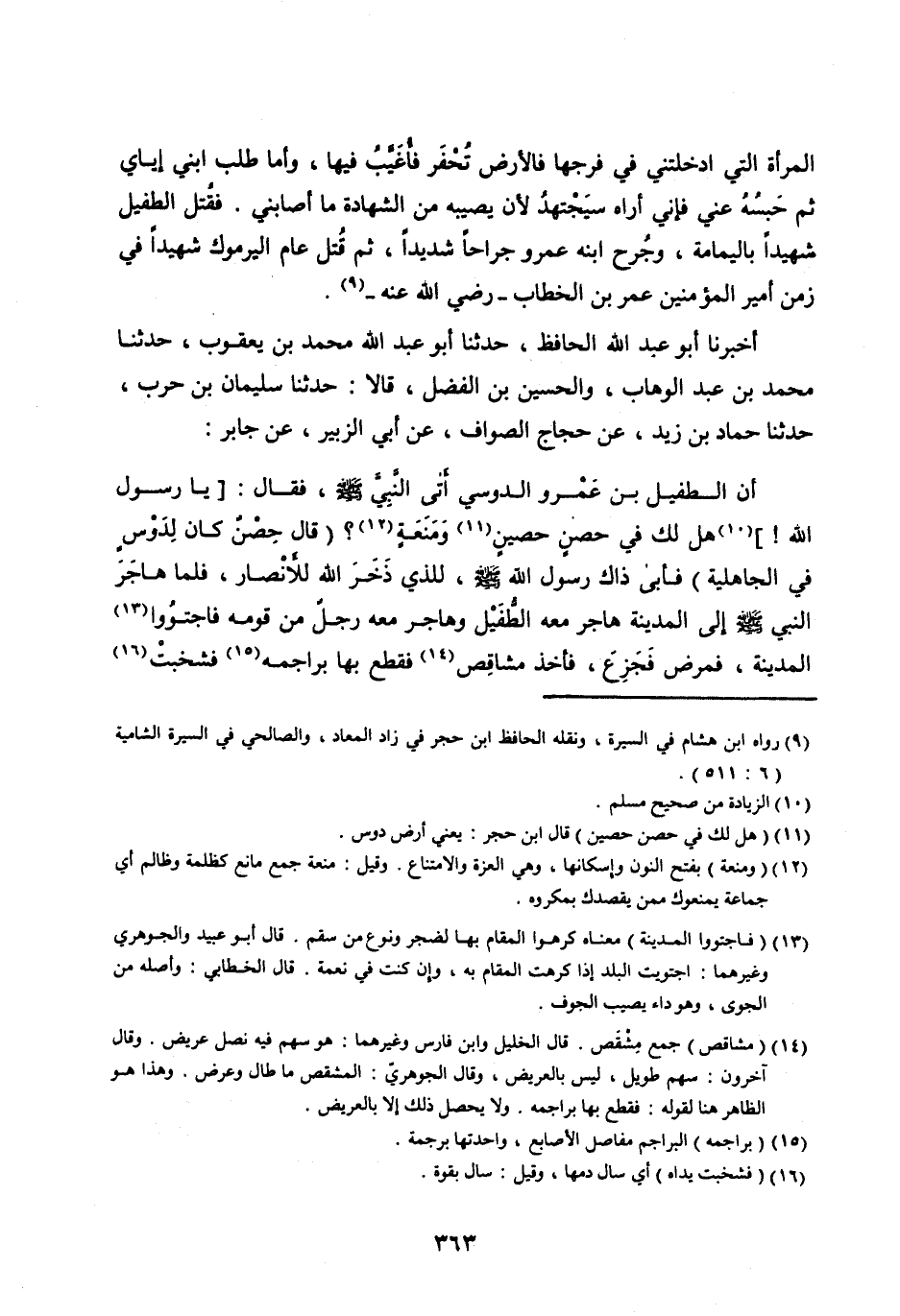 أَنَّ الطُّفَيْلَ بْنَ عَمْرٍو الدَّوْسِيَّ أَتَى النَّبِيَّ صَلَّى اللهُ عَلَيْهِ وَسَلَّمَ، فَقَالَ: [يَا رَسُولَ اللهِ!] [ (10) ] هَلْ لَكَ فِي حِصْنٍ حَصِينٍ [ (11) ] وَمَنَعَةٍ [ (12) ] ؟ (قَالَ حِصْنٌ كَانَ لِدَوْسٍ فِي الْجَاهِلِيَّةِ) فَأَبَى ذَاكَ رَسُولُ الله صلى الله عليه وَسَلَّمَ، لِلَّذِي ذَخَرَ اللهُ لِلْأَنْصَارِ، فَلَمَّا هَاجَرَ النَّبِيُّ صلى الله عليه وسلم إِلَى الْمَدِينَةِ هَاجَرَ مَعَهُ الطُّفَيْلُ وَهَاجَرَ مَعَهُ رَجُلٌ مِنْ قَوْمِهِ فَاجْتَوَوَا [ (13) ] الْمَدِينَةَ، فَمَرِضَ فَجَزِعَ، فَأَخَذَ مَشَاقِصَ [ (14) ] فَقَطَعَ بِهَا بَرَاجِمَهُ [ (15) ] فَشَخَبَتْ [ (16) ]