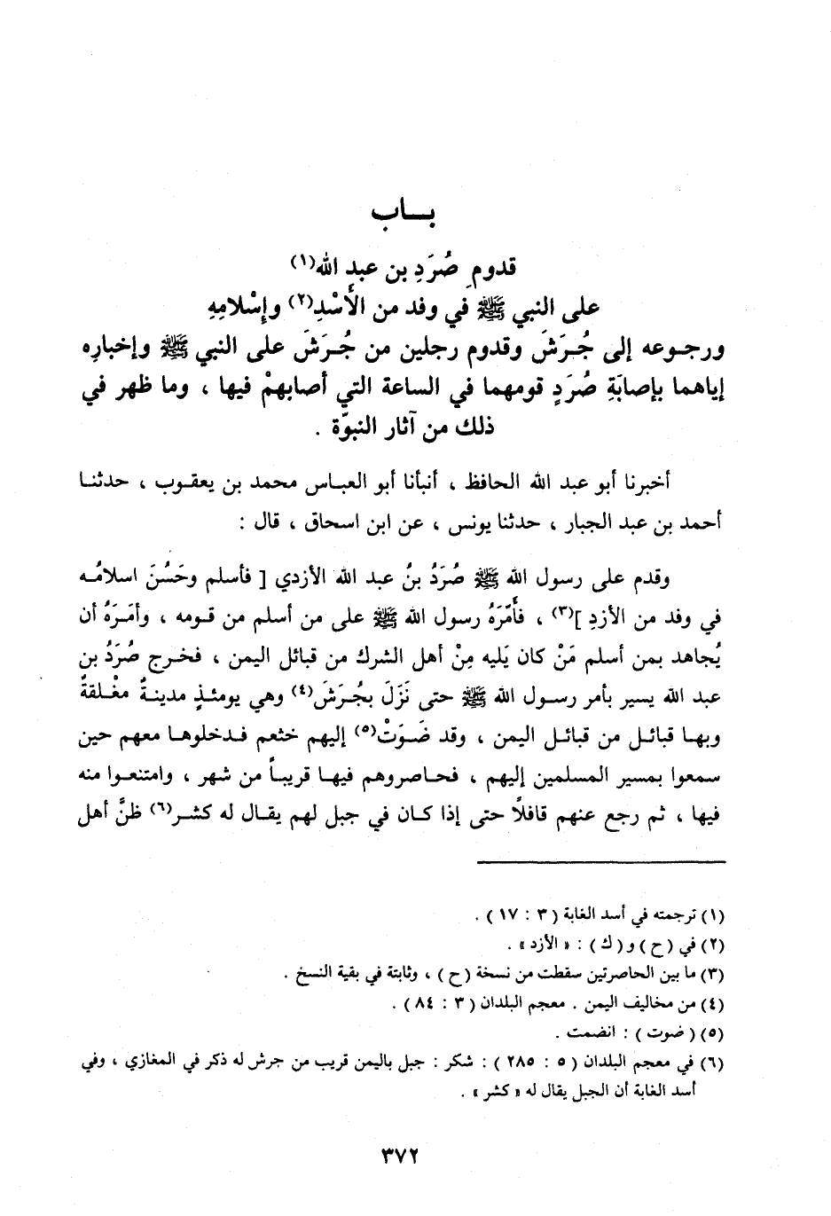 أَخْبَرَنَا أَبُو عَبْدِ اللهِ الْحَافِظُ، أَنْبَأَنَا أَبُو الْعَبَّاسِ مُحَمَّدُ بْنُ يَعْقُوبَ، حَدَّثَنَا أَحْمَدُ بْنُ عَبْدِ الْجَبَّارِ، حَدَّثَنَا يُونُسُ، عَنِ ابْنِ إِسْحَاقَ، قَالَ: وقَدِمَ عَلَى رَسُولِ اللهِ صَلَّى اللهُ عَلَيْهِ وَسَلَّمَ صُرَدُ بْنُ عَبْدِ اللهِ الْأَزْدِيُّ [فَأَسْلَمَ وَحَسُنَ إِسْلَامُهُ فِي وَفْدٍ مِنَ الْأَزْدِ] [ (3) ] ، فَأَمَّرَهُ رَسُولُ اللهِ صلى الله عَلَيْهِ وَسَلَّمَ عَلَى مَنِ أَسْلَمَ مِنْ قَوْمِهِ، وَأَمَرَهُ أَنْ يُجَاهِدَ بِمَنْ أَسْلَمَ مَنْ كَانَ يَلِيهِ مِنْ أَهْلِ الشِّرْكِ مِنْ قَبَائِلِ الْيَمَنِ، فَخَرَجَ صُرَدُ بْنُ عَبْدِ اللهِ يَسِيرُ بِأَمْرِ رَسُولِ اللهِ صَلَّى اللهُ عَلَيْهِ وَسَلَّمَ حَتَّى نَزَلَ بِجُرَشَ [ (4) ] وَهِيَ يَوْمَئِذٍ مَدِينَةٌ مُغْلَقَةٌ وَبِهَا قَبَائِلُ مِنْ قَبَائِلِ الْيَمَنِ، وَقَدْ ضَوَتْ [ (5) ] إِلَيْهِمْ خَثْعَمُ فَدَخَلُوهَا مَعَهُمْ حِينَ سَمِعُوا بِمَسِيرِ الْمُسْلِمِينَ إِلَيْهِمْ، فَحَاصَرُوهُمْ فِيهَا قَرِيبًا مِنْ شَهْرٍ، وَامْتَنَعُوا مِنْهُ فِيهَا، ثُمَّ رَجَعَ عَنْهُمْ قَافِلًا حَتَّى إِذَا كَانَ فِي جَبَلٍ لَهُمْ يُقَالُ لَهُ كَشَرٌ [ (6) ] ظنّ أهل