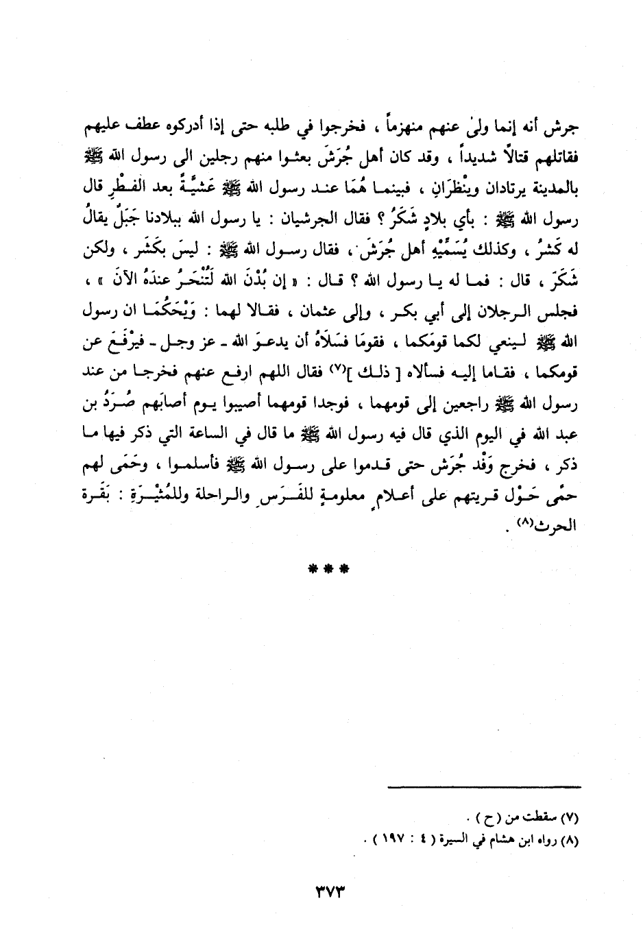جُرَشَ أَنَّهُ إِنَّمَا وَلَّى عَنْهُمْ مُنْهَزِمًا، فَخَرَجُوا فِي طَلَبِهِ حَتَّى إِذَا أَدْرَكُوهُ عَطَفَ عَلَيْهِمْ فَقَاتَلَهُمْ قِتَالًا شَدِيدًا، وَقَدْ كَانَ أَهْلُ جُرَشَ بَعَثُوا مِنْهُمْ رَجُلَيْنِ إِلَى رَسُولِ اللهِ صَلَّى اللهُ عَلَيْهِ وَسَلَّمَ بِالْمَدِينَةِ يَرْتَادَانِ وَيَنْظُرَانِ، فَبَيْنَمَا هُمَا عِنْدَ رَسُولِ اللهِ صَلَّى اللهُ عَلَيْهِ وَسَلَّمَ عَشِيَّةً بَعْدَ الْفِطْرِ قَالَ رَسُولُ اللهِ صَلَّى الله عليه وَسَلَّمَ: بِأَيِّ بِلَادٍ شَكَرٌ؟ فَقَالَ الْجُرَشِيَّانِ: يَا رَسُولَ اللهِ بِبِلَادِنَا جَبَلٌ يُقَالُ لَهُ كَشَرٌ، وَكَذَلِكَ يُسَمِّيهِ أَهْلُ جُرَشَ، فَقَالَ رَسُولُ اللهِ صَلَّى اللهُ عَلَيْهِ وَسَلَّمَ: لَيْسَ بِكَشَرٍ، وَلَكِنْ شَكَرٌ، قَالَ: فَمَا لَهُ يَا رَسُولَ اللهِ؟ قَالَ: «إِنَّ بُدْنَ اللهِ لَتُنْحَرُ عِنْدَهُ الْآنَ» ، فَجَلَسَ الرَّجُلَانِ إِلَى أَبِي بَكْرٍ، وَإِلَى عُثْمَانَ، فَقَالَا لَهُمَا: وَيْحَكُمَا أن رسول الله صلى اللهُ عَلَيْهِ وَسَلَّمَ لَيَنْعِي لَكُمَا قَوْمَكُمَا، فَقُومَا فَسَلَاهُ أَنْ يَدْعُوَ اللهَ- عَزَّ وَجَلَّ- فَيَرْفَعَ عَنْ قَوْمِكُمَا، فَقَامَا إِلَيْهِ فَسَأَلَاهُ [ذَلِكَ] [ (7) ] فَقَالَ اللهُمَّ ارْفَعْ عَنْهُمْ فَخَرَجَا مِنْ عِنْدِ رَسُولِ اللهِ صَلَّى اللهُ عَلَيْهِ وَسَلَّمَ رَاجِعِينَ إِلَى قَوْمِهِمَا، فوجدا قَوْمَهُمَا أُصِيبُوا يَوْمَ أَصَابَهُمْ صُرَدُ بْنُ عَبْدِ اللهِ فِي الْيَوْمِ الَّذِي قَالَ فِيهِ رَسُولُ اللهِ صَلَّى اللهُ عَلَيْهِ وَسَلَّمَ مَا قَالَ فِي السَّاعَةِ الَّتِي ذَكَرَ فِيهَا مَا ذَكَرَ، فَخَرَجَ وَفْدُ جُرَشَ حَتَّى قَدِمُوا عَلَى رَسُولِ اللهِ صَلَّى اللهُ عليه وسلم فَأَسْلَمُوا، وَحَمَى لَهُمْ حِمًى حَوْلَ قَرْيَتِهِمْ عَلَى أَعْلَامٍ مَعْلُومَةٍ لِلْفَرَسِ وَالرَّاحِلَةِ وَلِلْمُثِيرَةِ: بقرة الحرث [ (8) ] .