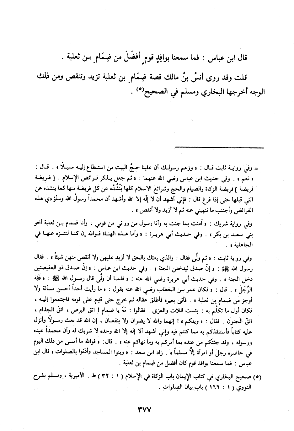 قُلْتُ وَقَدْ رَوَى أَنَسُ بْنُ مَالِكٍ قِصَّةَ ضِمَامِ بْنِ ثَعْلَبَةَ تَزِيدُ وَتُنْقَصُ ومن ذلك الوجه أَخْرَجَهَا الْبُخَارِيُّ وَمُسْلِمٌ فِي الصَّحِيحِ [ (5) ] .