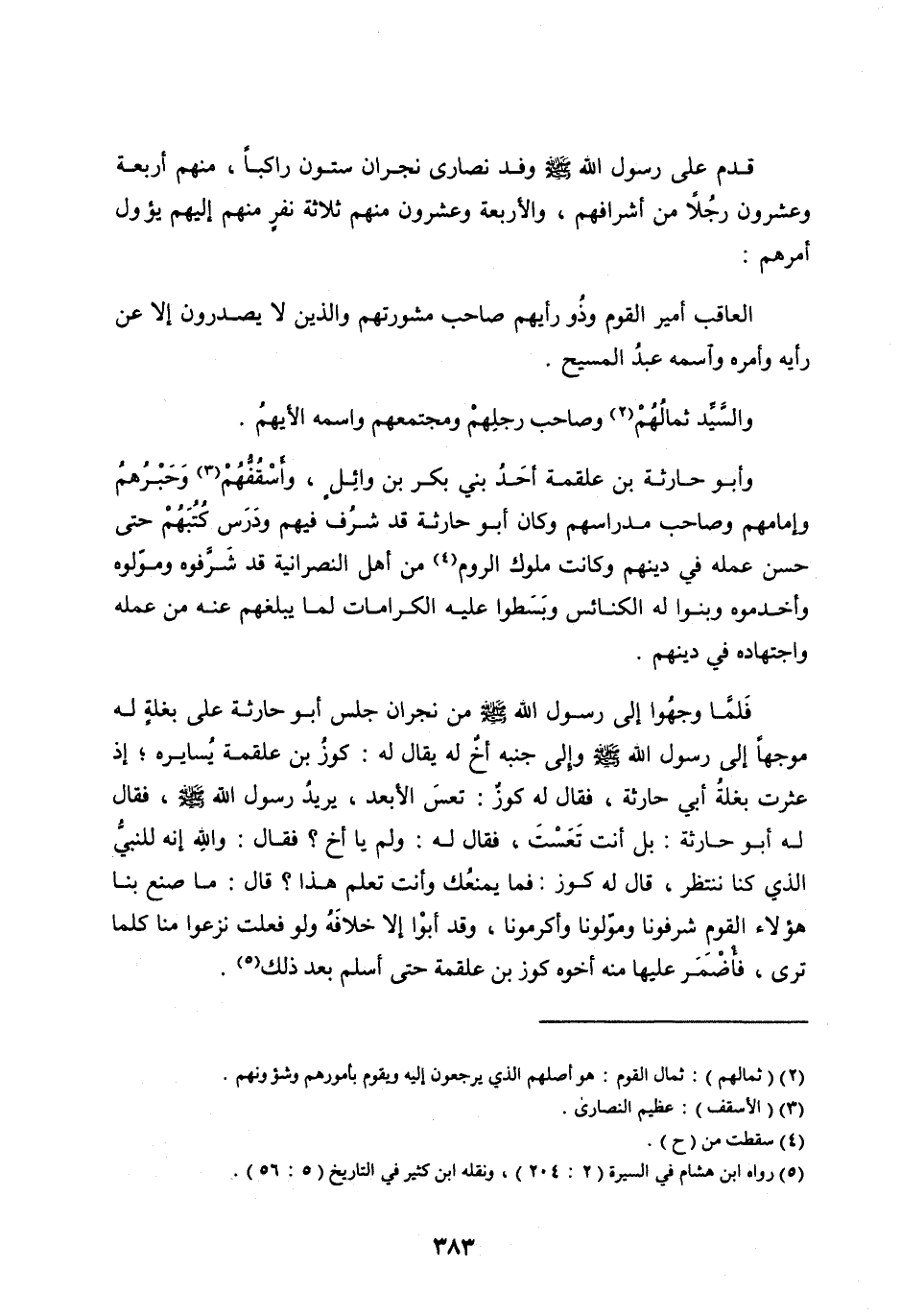 قَدِمَ عَلَى رَسُولِ اللهِ صَلَّى اللهُ عَلَيْهِ وسلم وَفْدُ نَصَارَى نَجْرَانَ سِتُّونَ رَاكِبًا، مِنْهُمْ أَرْبَعَةٌ وَعِشْرُونَ رَجُلًا مِنْ أَشْرَافِهِمْ، وَالْأَرْبَعَةُ وَعِشْرُونَ مِنْهُمْ ثَلَاثَةُ نَفَرٍ منهم إليهم يؤول أَمْرُهُمُ: