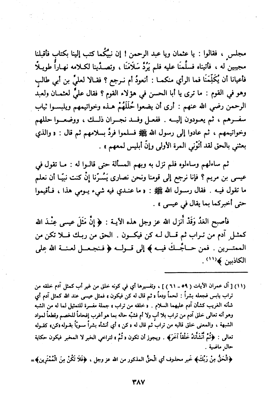 فَأَصْبَحَ الْغَدُ وَقَدْ أَنْزَلَ اللهُ عَزَّ وَجَلَّ هَذِهِ الْآيَةَ: إِنَّ مَثَلَ عِيسى عِنْدَ اللَّهِ كَمَثَلِ آدَمَ خَلَقَهُ مِنْ تُرابٍ ثُمَّ قالَ لَهُ كُنْ فَيَكُونُ. الْحَقُّ مِنْ رَبِّكَ فَلا تَكُنْ مِنَ الْمُمْتَرِينَ. فَمَنْ حَاجَّكَ فِيهِ إلى قوله فَنَجْعَلْ لَعْنَتَ اللَّهِ عَلَى الْكاذِبِينَ [ (11) ] .