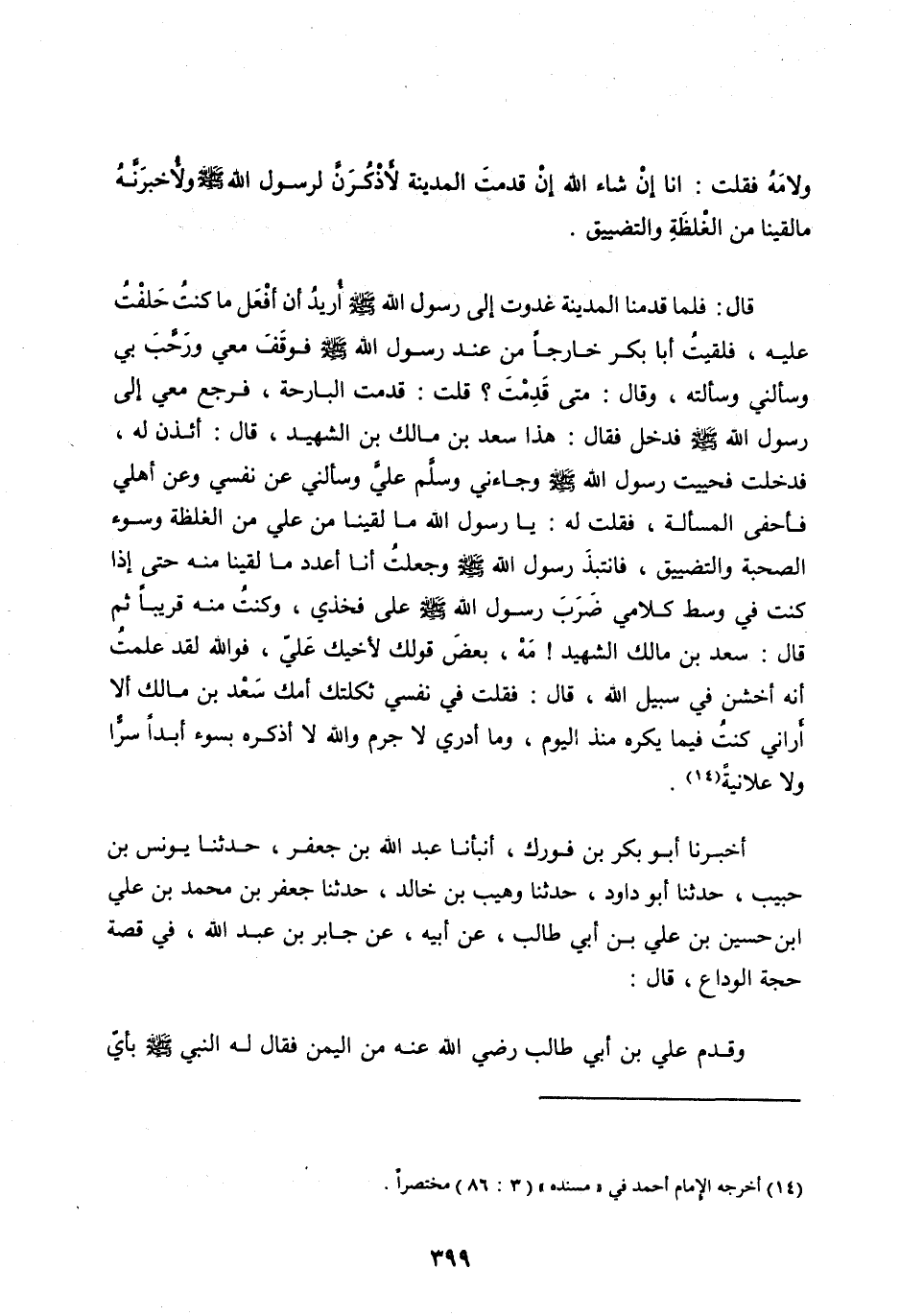 قَالَ: فَلَمَّا قَدِمْنَا الْمَدِينَةَ غَدَوْتُ إِلَى رَسُولِ اللهِ صَلَّى الله عَلَيْهِ وَسَلَّمَ أُرِيدُ أَنْ أَفْعَلَ مَا كُنْتُ حَلَفْتُ عَلَيْهِ، فَلَقِيتُ أَبَا بَكْرٍ خَارِجًا مِنْ عِنْدِ رَسُولِ اللهِ صَلَّى اللهُ عَلَيْهِ وَسَلَّمَ فَوَقَفَ مَعِي وَرَحَّبَ بِي وَسَأَلَنِي وَسَأَلْتُهُ، وَقَالَ: مَتَى قَدِمْتَ؟ قُلْتُ: قَدِمْتُ الْبَارِحَةَ، فَرَجَعَ مَعِي إِلَى رَسُولِ اللهِ صَلَّى الله عَلَيْهِ وَسَلَّمَ فَدَخَلَ فَقَالَ: هَذَا سَعْدُ بْنُ مَالِكِ بْنِ الشَّهِيدِ، قَالَ: ائْذَنْ لَهُ، فَدَخَلْتُ فَحَيَّيْتُ رَسُولَ الله صلى الله عليه وَسَلَّمَ وَجَاءَنِي وَسَلَّمَ عَلَيَّ وَسَأَلَنِي عَنْ نَفْسِي وَعَنْ أهلي فأخفى الْمَسْأَلَةَ، فَقُلْتُ لَهُ: يَا رَسُولَ اللهِ مَا لَقِينَا مِنْ عَلِيٍّ مِنَ الْغِلْظَةَ وَسُوءِ الصُّحْبَةِ وَالتَّضْيِيقِ، فَانْتَبَذَ رسول الله صلى الله عَلَيْهِ وَسَلَّمَ وَجَعَلْتُ أَنَا أُعَدِّدُ مَا لَقِينَا مِنْهُ حَتَّى إِذَا كُنْتُ فِي وَسَطِ كَلَامِي ضَرَبَ رَسُولُ اللهِ صَلَّى الله عليه وَسَلَّمَ عَلَى فَخِذِي، وَكُنْتُ مِنْهُ قَرِيبًا ثُمَّ قَالَ: سَعْدُ بْنَ مَالِكٍ الشَّهِيدُ! مَهْ، بَعْضَ قَوْلِكَ لِأَخِيكَ عليّ، فو الله لَقَدْ عَلِمْتُ أَنَّهُ أَخْشَنُ فِي سَبِيلِ اللهِ، قَالَ: فَقُلْتُ فِي نَفْسِي ثَكِلَتْكَ أُمُّكَ سَعْدُ بْنَ مَالِكٍ أَلَا أُرَانِي كُنْتُ فِيمَا يَكْرَهُ مُنْذُ الْيَوْمِ، وَمَا أَدْرِي لَا جَرَمَ وَاللهِ لَا أَذْكُرُهُ بِسُوءٍ أَبَدًا سِرًّا وَلَا عَلَانِيَةً [ (14) ] .