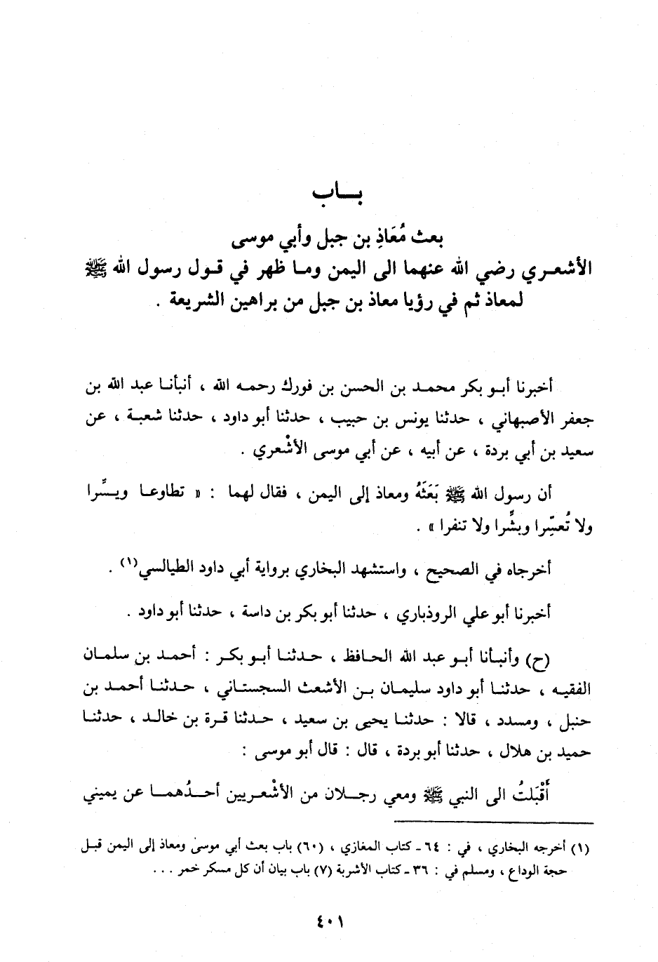 [ (1) ] أخرجه البخاري، في: 64- كتاب المغازي، (60) باب بعث أبي موسى ومعاذ إلى اليمن قبل حجة الوداع، ومسلم في: 36- كتاب الأشربة (7) باب بيان أن كل مسكر خمر ...