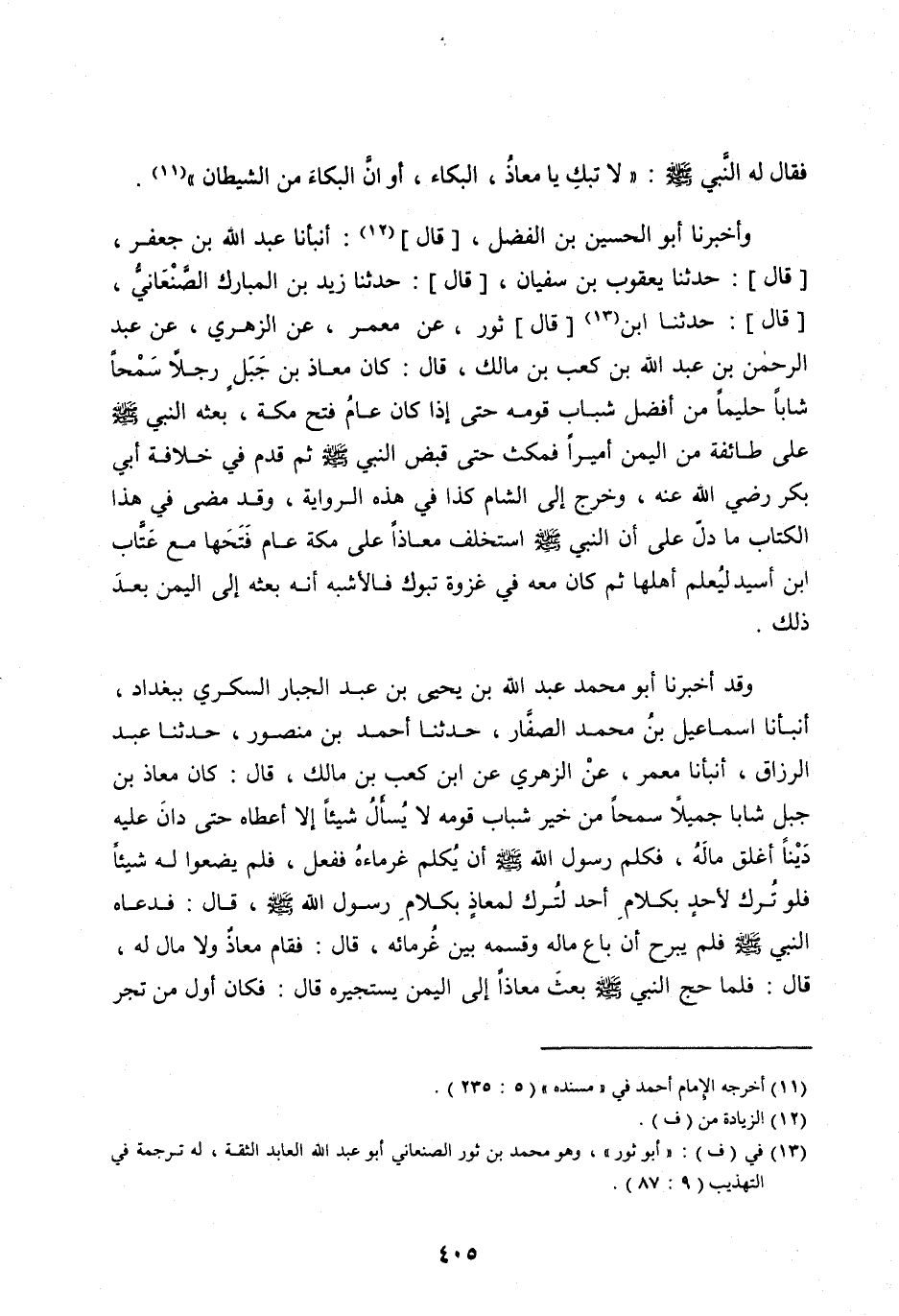 وأَخْبَرَنَا أَبُو الْحُسَيْنِ بْنُ الْفَضْلِ، [قَالَ] [ (12) ] : أَنْبَأَنَا عَبْدُ اللهِ بْنُ جَعْفَرٍ، [قَالَ] : حَدَّثَنَا يَعْقُوبُ بْنُ سُفْيَانَ، [قَالَ] : حَدَّثَنَا زَيْدُ بْنُ الْمُبَارَكِ الصَّنْعَانِيُّ، [قَالَ] : حدثنا ابن [ (13) ] [قال] ثَوْرٍ، عَنْ مَعْمَرٌ، عَنِ الزُّهْرِيِّ، عَنْ عَبْدِ الرَّحْمَنِ بْنِ عبد الله بن كَعْبِ بْنِ مَالِكٍ، قَالَ: كَانَ مُعَاذُ بْنُ جَبَلٍ رَجُلًا سَمْحًا شَابًّا حَلِيمًا مِنْ أَفْضَلِ شَبَابِ قَوْمِهِ حَتَّى إِذَا كَانَ عَامُ فَتْحِ مَكَّةَ، بَعَثَهُ النَّبِيُّ صلى الله عليه وسلم عَلَى طَائِفَةٍ مِنَ الْيَمَنِ أَمِيرًا فَمَكَثَ حَتَّى قُبِضَ النَّبِيُّ صَلَّى اللهُ عليه وَسَلَّمَ ثُمَّ قَدِمَ فِي خِلَافَةِ أَبِي بَكْرٍ رَضِيَ اللهُ عَنْهُ، وَخَرَجَ إِلَى الشَّامِ كَذَا فِي هَذِهِ الرِّوَايَةِ، وَقَدْ مَضَى فِي هَذَا الْكِتَابِ مَا دَلَّ عَلَى أَنَّ النَّبِيَّ صَلَّى اللهُ عَلَيْهِ وَسَلَّمَ اسْتَخْلَفَ مُعَاذًا عَلَى مَكَّةَ عَامَ فَتْحِهَا مَعَ عتّاب ابن أَسِيدٍ لِيُعَلِّمَ أَهْلَهَا ثُمَّ كَانَ مَعَهُ فِي غَزْوَةِ تَبُوكَ فَالْأَشْبَهُ أَنَّهُ بَعَثَهُ إِلَى الْيَمَنِ بَعْدَ ذَلِكَ.