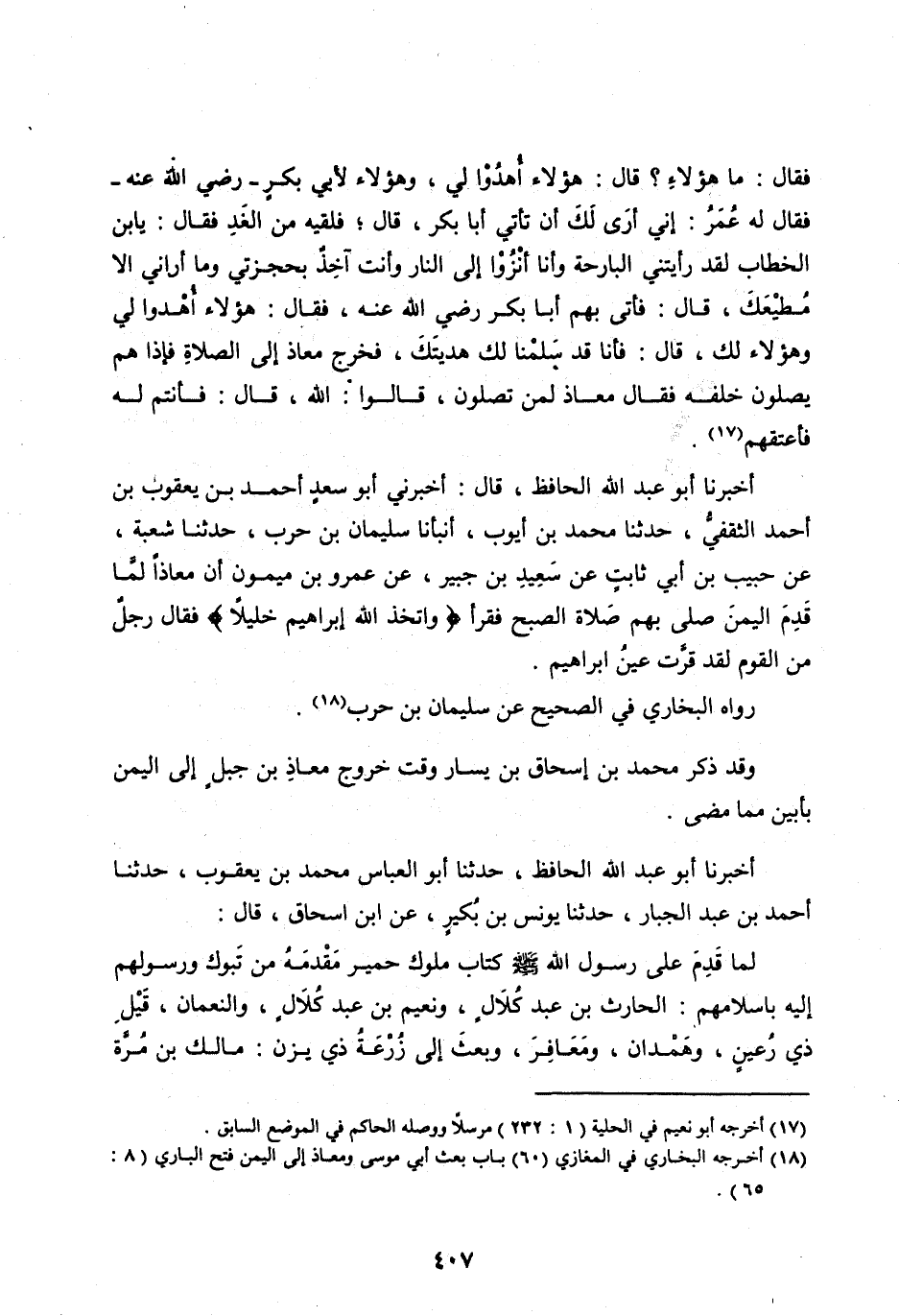 فَقَالَ: مَا هَؤُلَاءِ؟ قَالَ: هَؤُلَاءِ أُهْدَوْا لِي، وهؤلاء لِأَبِي بَكْرٍ- رَضِيَ اللهُ عَنْهُ- فَقَالَ لَهُ عُمَرُ: إِنِّي أَرَى لَكَ أَنْ تَأْتِيَ أَبَا بَكْرٍ، قَالَ، فَلَقِيَهُ مِنَ الْغَدِ فَقَالَ: يَا ابْنَ الْخَطَّابِ لَقَدْ رَأَيْتُنِي الْبَارِحَةَ وَأَنَا أَنْزُو إِلَى النَّارِ وَأَنْتَ آخِذٌ بِحُجْزَتِي وَمَا أُرَانِي إِلَّا مُطِيعَكَ، قَالَ: فَأَتَى بِهِمْ أَبَا بَكْرٍ رَضِيَ اللهُ عَنْهُ، فَقَالَ: هَؤُلَاءِ أُهْدُوا لِي وَهَؤُلَاءِ لَكَ، قَالَ: فَإِنَّا قَدْ سَلَّمْنَا لَكَ هَدِيَّتَكَ، فَخَرَجَ مُعَاذٌ إِلَى الصَّلَاةِ فَإِذَا هُمْ يُصَلُّونَ خَلْفَهُ فَقَالَ مُعَاذٌ لِمَنْ تصلون، قالوا: الله، قَالَ: فَأَنْتُمْ لَهُ فَأَعْتَقَهُمْ [ (17) ] .