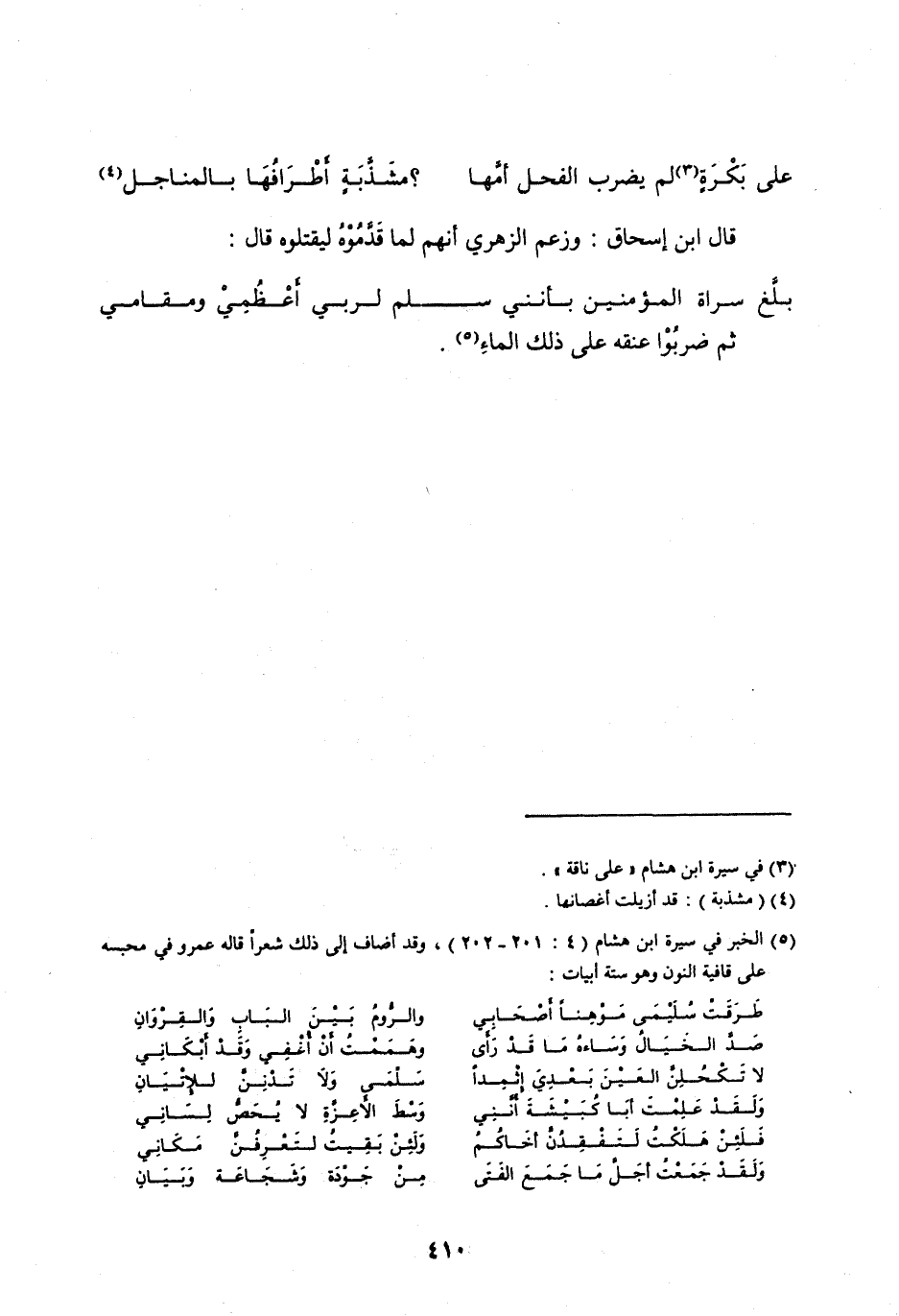 [ (5) ] الخبر في سيرة ابن هشام (4: 201- 202) ، وقد أضاف إلى ذلك شعرا قاله عمرو في محبسه على قافية النون وهو ستة أبيات: