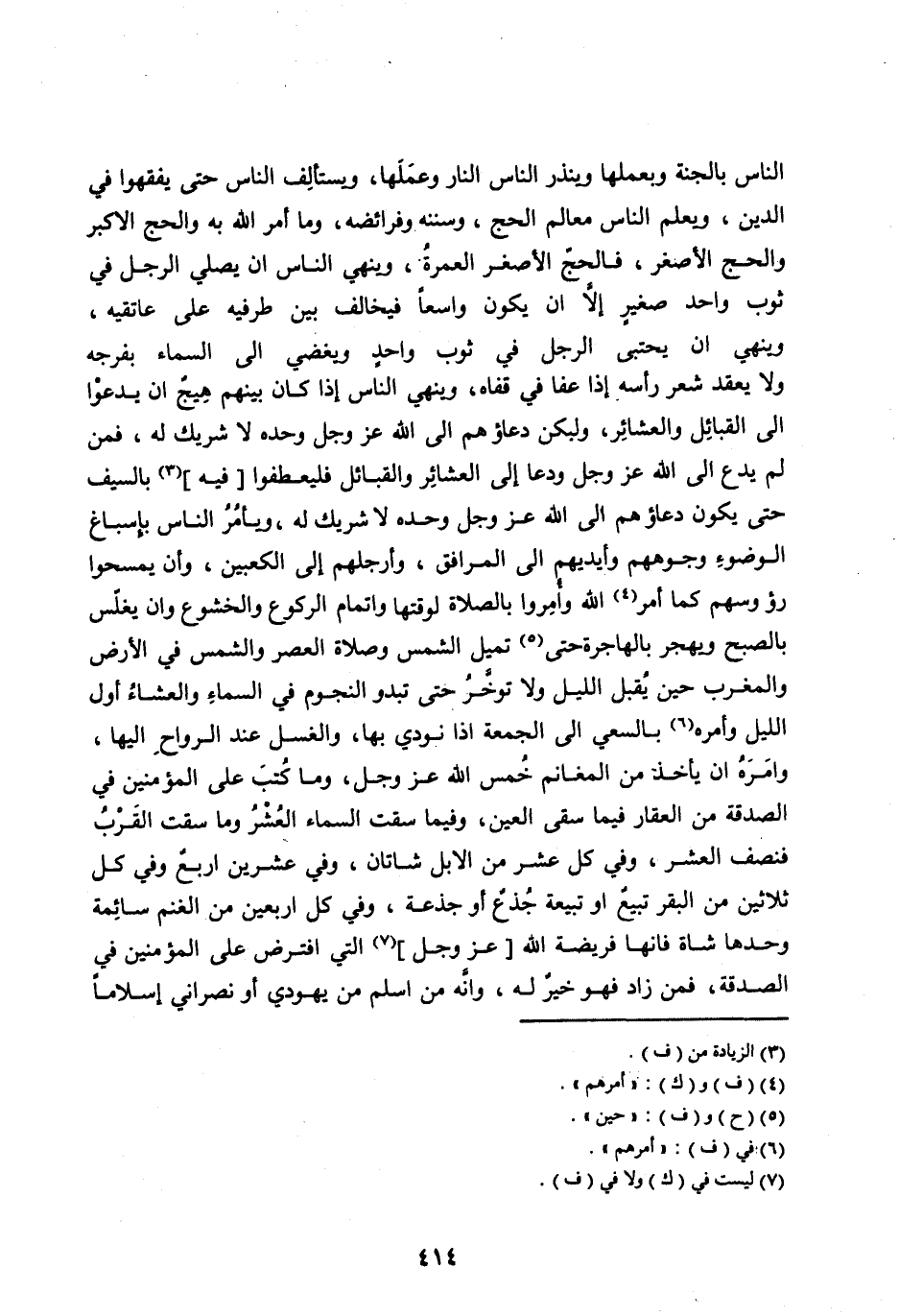 النَّاسَ بِالْجَنَّةِ وَبِعَمَلِهَا وَيُنْذِرَ النَّاسَ النَّارَ وَعَمَلَهَا، وَيَسْتَأْلِفَ النَّاسَ حَتَّى يُفَقَّهُوا فِي الدِّينِ، وَيُعَلِّمَ النَّاسَ مَعَالِمَ الْحَجِّ، وَسُنَنَهِ وَفَرَائِضَهُ، وَمَا أَمَرَ اللهُ بِهِ وَالْحَجَّ الْأَكْبَرَ وَالْحَجَّ الْأَصْغَرَ فَالْحَجُّ الْأَصْغَرُ الْعُمْرَةُ، وَيَنْهَى النَّاسَ أَنْ يُصَلِّيَ الرَّجُلُ فِي ثَوْبٍ وَاحِدٍ صَغِيرٍ إِلَّا أَنْ يَكُونَ وَاسِعًا فَيُخَالِفُ بَيْنَ طَرَفَيْهِ عَلَى عَاتِقَيْهِ، وَيَنْهَى أَنْ يَحْتَبِيَ الرَّجُلُ فِي ثَوْبٍ وَاحِدٍ وَيُغْضِيَ إِلَى السَّمَاءِ بِفَرْجِهِ وَلَا يَعْقِدُ شَعْرَ رَأْسِهِ إِذَا عَفَا فِي قَفَاهُ، وَيَنْهَى النَّاسَ إِذَا كَانَ بَيْنَهُمْ هَيْجٌ أَنْ يَدْعُوا إِلَى الْقَبَائِلِ وَالْعَشَائِرِ، وَلْيَكُنْ دُعَاؤُهُمْ إِلَى اللهِ عَزَّ وَجَلَّ وَحْدَهُ لَا شَرِيكَ لَهُ، فَمَنْ لَمْ يَدْعُ إِلَى اللهِ عَزَّ وَجَلَّ وَدَعَا إِلَى الْعَشَائِرِ وَالْقَبَائِلِ فَلْيَعْطِفُوا [فِيهِ] [ (3) ] بِالسَّيْفِ حَتَّى يَكُونَ دُعَاؤُهُمْ إِلَى اللهِ عَزَّ وَجَلَّ وَحْدَهُ لَا شَرِيكَ لَهُ، وَيَأْمُرَ النَّاسَ بِإِسْبَاغِ الْوُضُوءِ وُجُوهَهُمْ وَأَيْدِيَهُمْ إِلَى الْمَرَافِقِ، وَأَرْجُلَهُمْ إِلَى الْكَعْبَيْنِ، وأن يمسحوا رؤوسهم كَمَا أَمَرَ [ (4) ] اللهُ وَأُمِرُوا بِالصَّلَاةِ لِوَقْتِهَا وَإِتْمَامِ الرُّكُوعِ وَالْخُشُوعِ وَأَنْ يُغَلِّسَ بِالصُّبْحِ وَيُهَجِّرَ بِالْهَاجِرَةِ حَتَّى [ (5) ] تَمِيلَ الشَّمْسُ وَصَلَاةُ الْعَصْرِ وَالشَّمْسُ فِي الْأَرْضِ وَالْمَغْرِبُ حِينَ يقبل الليل ولا توخّر حَتَّى تَبْدُوَ النُّجُومُ فِي السَّمَاءِ وَالْعِشَاءُ أَوَّلَ اللَّيْلِ وَأَمَرَهُ [ (6) ] بِالسَّعْيِ إِلَى الْجُمُعَةِ إِذَا نُودِيَ بِهَا، وَالْغُسْلِ عِنْدَ الرَّوَاحِ إِلَيْهَا، وَأَمَرَهُ أَنْ يَأْخُذَ مِنَ الْمَغَانِمِ خُمُسَ اللهِ عَزَّ وَجَلَّ، وَمَا كَتَبَ عَلَى الْمُؤْمِنِينَ فِي الصَّدَقَةِ مِنَ الْعَقَارِ فِيمَا سَقَى الْعَيْنُ، وَفِيمَا سَقَتِ السَّمَاءُ الْعُشْرُ وَمَا سَقَتِ الْقِرَبُ فَنِصْفُ الْعُشْرِ، وَفِي كُلِّ عَشْرٍ مِنَ الْإِبِلِ شَاتَانِ، وَفِي عِشْرِينَ أَرْبَعٌ وَفِي كُلِّ ثَلَاثِينَ مِنَ الْبَقَرِ تَبِيعٌ أَوْ تَبِيعَةٌ جَذَعٌ أَوْ جَذَعَةٌ، وَفِي كُلِّ أَرْبَعِينَ مِنَ الْغَنَمِ سَائِمَةٌ وَحْدَهَا شَاةٌ فَإِنَّهَا فَرِيضَةُ اللهِ [عَزَّ وَجَلَّ] [ (7) ] الَّتِي افْتَرَضَ عَلَى الْمُؤْمِنِينَ فِي الصَّدَقَةِ، فَمَنْ زَادَ فَهُوَ خَيْرٌ لَهُ، وَأَنَّهُ مَنْ أَسْلَمَ مِنْ يَهُوَدِيٍّ أَوْ نَصْرَانِيٍّ إِسْلَامًا