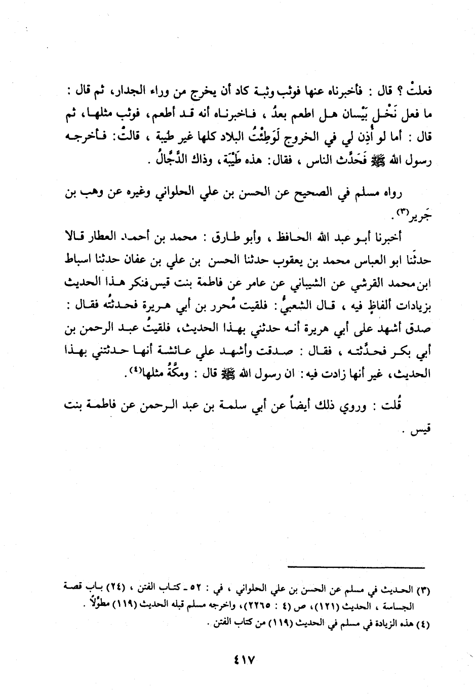 [ (3) ] الحديث في مسلم عَنِ الْحَسَنِ بْنِ عَلِيٍّ الحلواني، في: 52- كتاب الفتن، (24) باب قصة الجساسة، الحديث (121) ، ص (4: 2265) ، وأخرجه مسلم قبله الحديث (119) مطوّلا.