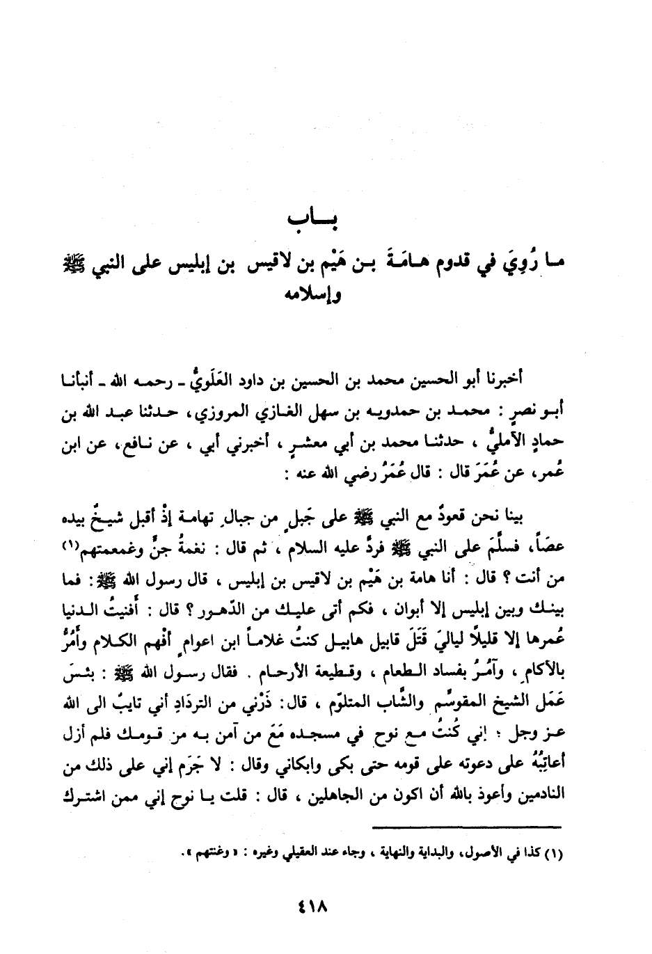 أَخْبَرَنَا أَبُو الْحُسَيْنِ مُحَمَّدُ بْنُ الْحُسَيْنِ بْنِ دَاوُدَ الْعَلَوِيُّ- رَحِمَهُ اللهُ- أَنْبَأَنَا أَبُو نَصْرٍ: مُحَمَّدُ بْنُ حَمْدَوَيْهِ بن سهل الغازي الْمَرْوَزِيُّ، حَدَّثَنَا عَبْدُ اللهِ بْنُ حَمَّادٍ الْآمُلِيُّ، حَدَّثَنَا مُحَمَّدُ بْنُ أَبِي مَعْشَرٍ، أَخْبَرَنِي أَبِي، عَنْ نَافِعٍ، عَنِ ابْنِ عُمَرَ، عَنْ عُمَرَ قَالَ: قَالَ عُمَرُ رَضِيَ اللهُ عَنْهُ: بَيْنَا نَحْنُ قُعُودٌ مَعَ النَّبِيِّ صَلَّى اللهُ عَلَيْهِ وسلم عَلَى جَبَلٍ مِنْ جِبَالِ تِهَامَةَ إِذْ أَقْبَلَ شَيْخٌ بِيَدِهِ عَصًا، فَسَلَّمَ عَلَى النَّبِيِّ صَلَّى الله عليه وَسَلَّمَ فَرَدَّ عَلَيْهِ السَّلَامَ، ثُمَّ قَالَ: نَغَمَةُ جِنٍّ وغمعمتهم [ (1) ] مَنْ أَنْتَ؟ قَالَ: أَنَا هَامَةُ بْنُ هَيْمَ بْنِ لَاقِيسَ بْنِ إِبْلِيسَ، قَالَ رَسُولُ اللهِ صَلَّى اللهُ عَلَيْهِ وَسَلَّمَ: فَمَا بَيْنَكَ وَبَيْنَ إِبْلِيسَ إِلَّا أَبَوَانِ، فَكَمْ أَتَى عَلَيْكَ مِنَ الدُّهُورِ؟ قَالَ: أَفْنَيْتُ الدُّنْيَا عُمُرَهَا إِلَّا قَلِيلًا لَيَالِيَ قَتَلَ قَابِيلُ هَابِيلَ كُنْتُ غُلَامًا ابْنَ أَعْوَامٍ أَفْهَمُ الْكَلَامَ وَأَمُرُّ بِالْآكَامِ، وَآمُرُ بِفَسَادِ الطَّعَامِ، وَقَطِيعَةِ الْأَرْحَامِ. فَقَالَ رَسُولُ اللهِ صَلَّى اللهُ عَلَيْهِ وَسَلَّمَ: بِئْسَ عمل الشيخ المقوسّم وَالشَّابِّ الْمُتَلَوِّمِ، قَالَ: ذَرْنِي مِنَ التِّرْدَادِ إِنِّي تَائِبٌ إِلَى اللهِ عَزَّ وَجَلَّ، إِنِّي كُنْتُ مَعَ نُوحٍ، فِي مَسْجِدِهِ مَعَ مَنْ آمن به من قومك فَلَمْ أَزَلْ أُعَاتِبُهُ عَلَى دَعْوَتِهِ عَلَى قَوْمِهِ حَتَّى بَكَى وَأَبْكَانِي وَقَالَ: لَا جرم أني على ذلك مِنَ النَّادِمِينَ وَأَعُوذُ بِاللهِ أَنْ أَكُونَ مِنَ الْجَاهِلِينَ، قَالَ: قُلْتُ يَا نُوحُ إني ممن اشترك