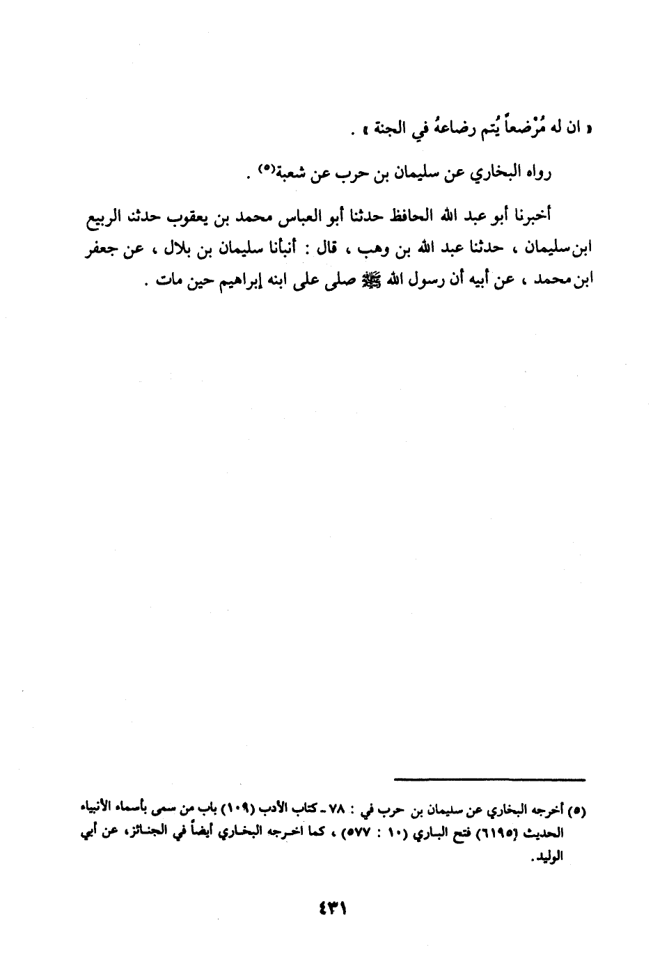 [ (5) ] أخرجه الْبُخَارِيُّ عَنْ سُلَيْمَانَ بْنِ حَرْبٍ في: 78- كتاب الأدب (109) باب من سمى بأسماء الأنبياء الحديث (6195) فتح الباري (10: 577) ، كما أخرجه البخاري أيضا في الجنائز، عن أبي الوليد.