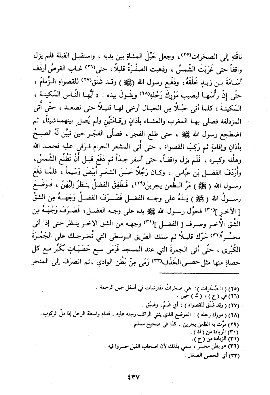 نَاقَتِهِ إِلَى الصَّخْرَاتِ [ (25) ] ، وَجَعَلَ حَبْلَ الْمُشَاةِ بَيْنَ يَدَيْهِ، وَاسْتَقْبَلَ الْقِبْلَةَ فَلَمْ يَزَلْ وَاقِفًا حَتَّى غَرَبَتِ الشَّمْسُ، وَذَهَبَتِ الصُّفْرَةُ قَلِيلًا، حَتَّى [ (26) ] غاب القرص أردف أسامة بن زيد خلقه، وَدَفَعَ رَسُولُ اللهِ (صَلَّى الله عليه وسلم) وقد شَنَقَ [ (27) ] لِلْقَصْوَاءِ الزِّمَامَ، حَتَّى إِنَّ رَأْسَهَا لَيُصِيبُ مَوْرِكَ رَحْلِهِ [ (28) ] وَيَقُولُ بَيَدِهِ: «أَيُّهَا النَّاسُ السَّكِينَةَ، السَّكِينَةَ» كُلَّمَا أَتَى حَبْلًا مِنَ الْحِبَالِ أَرْخَى لَهَا قَلِيلًا حَتَّى تَصْعَدَ، حَتَّى أَتَى الْمُزْدَلِفَةَ فَصَلَّى بِهَا الْمَغْرِبَ وَالْعِشَاءَ بِأَذَانٍ وَإِقَامَتَيْنِ وَلَمْ يُصَلِّ بَيْنَهُمَا شَيْئًا، ثُمَّ اضْطَجَعَ رَسُولُ اللهِ صلى الله عَلَيْهِ وَسَلَّمَ، حَتَّى طَلَعَ الْفَجْرُ، فَصَلَّى الْفَجْرَ حِينَ تَبَيَّنَ لَهُ الصُّبْحُ بِأَذَانٍ وَإِقَامَةٍ ثُمَّ رَكِبَ الْقَصْوَاءَ، حَتَّى أَتَى الْمَشْعَرَ الْحَرَامَ فَرَقِيَ عَلَيْهِ فَحَمِدَ اللهَ وَهَلَّلَهُ وَكَبَّرَهُ، فَلَمْ يَزَلْ وَاقِفًا، حَتَّى أَسْفَرَ جِدًّا ثُمَّ دَفَعَ قَبْلَ أَنْ تَطْلُعَ الشَّمْسُ، وَأَرْدَفَ الْفَضْلَ بْنَ عَبَّاسٍ، وَكَانَ رَجُلًا حَسَنَ الشَّعْرِ أَبْيَضَ وَسِيمًا، فَلَمَّا دَفَعَ رَسُولُ اللهِ (صَلَّى اللهُ عَلَيْهِ وسلم) مَرَّ الظُّعُنُ يَجْرِينَ [ (29) ] ، فَطَفِقَ الْفَضْلُ يَنْظُرُ إِلَيْهِنَّ، فَوَضَعَ رَسُولُ اللهِ (صَلَّى اللهُ عَلَيْهِ وَسَلَّمَ) يَدَهُ عَلَى وَجْهِ الْفَضْلِ فَصَرَفَ الْفَضْلُ وَجْهَهُ مِنَ الشِّقِّ [الْآخَرِ] [ (30) ] فَحَوَّلَ رَسُولُ اللهِ صَلَّى اللهُ عَلَيْهِ وَسَلَّمَ يَدَهُ عَلَى وَجْهِ الْفَضْلِ، فَصَرَفَ وَجْهَهُ مِنَ الشِّقِّ الْآخَرِ وَصَرَفَ [الْفَضْلُ] [ (31) ] وَجْهَهُ مِنَ الشِّقِّ الْآخَرِ يَنْظُرُ حَتَّى إِذَا أَتَى مُحَسِّرًا [ (32) ] حَرَّكَ قَلِيلًا ثُمَّ سَلَكَ الطَّرِيقَ الْوُسْطَى الَّتِي تُخْرِجُكَ عَلَى الْجَمْرَةِ الْكُبْرَى، حَتَّى أَتَى الْجَمْرَةَ الَّتِي عِنْدَ الْمَسْجِدِ فَرَمَى سبع حصيات بكبّر مَعَ كُلِّ حَصَاةٍ مِنْهَا مِثْلِ حَصَى الْخَذْفِ [ (33) ] رَمَى مِنْ بَطْنِ الْوَادِي، ثُمَّ انْصَرَفَ إِلَى المنحر