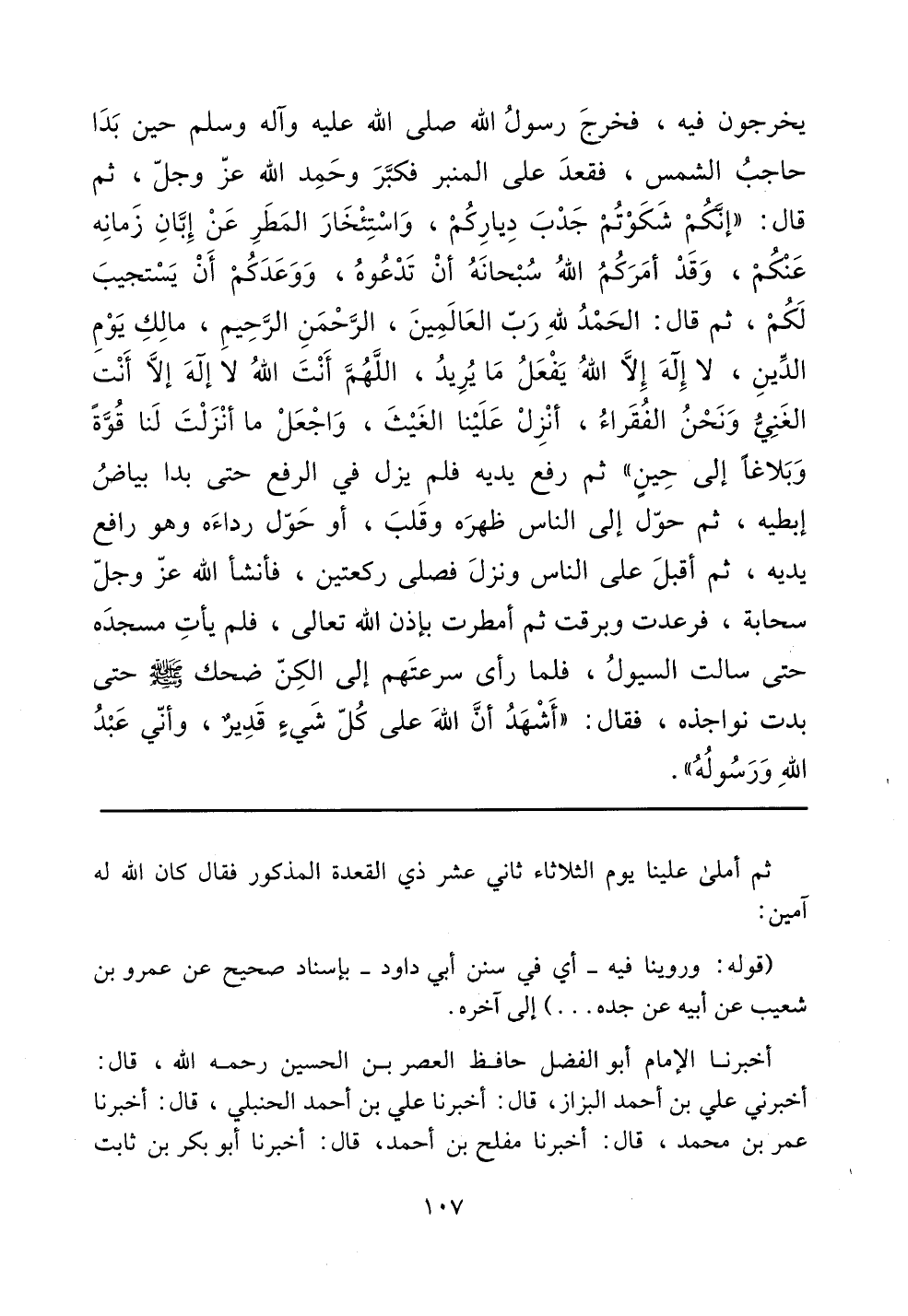 يخرجون فيه، فخرج رسول الله صلى الله عليه وآله وسلم حين بدا حاجب الشمس، فقعد على المنبر فكبر وحمد الله عز وجل، ثم قال: ((إنكم شكوتم جدب دياركم، واستئخار المطر عن إبان زمانه عنكم، وقد أمركم الله سبحانه أن تدعوه، ووعدكم أن يستجيب لكم، ثم قال: الحمد لله رب العالمين، الرحمن الرحيم، مالك يوم الدين، لا إله إلا الله يفعل ما يريد، اللهم أنت الله لا إله إلا أنت الغني ونحن الفقراء، أنزل علينا الغيث، واجعل ما أنزلت لنا قوةً وبلاغاً إلى حين)) ثم رفع يديه فلم يزل في الرفع حتى بدا بياض إبطيه، ثم حول إلى الناس ظهره وقلب، أو حول رداءه وهو رافع يديه، ثم أقبل على الناس ونزل فصلى ركعتين، فأنشأ الله عز وجل سحابة، فرعدت وبرقت ثم أمطرت بإذن الله تعالى، فلم يأت مسجده حتى سالت السيول، فلما رأى سرعتهم إلى الكن ضحك صلى الله عليه وسلم حتى بدت نواجذه، فقال: ((أشهد أن الله على كل شيءٍ قديرٌ، وأني عبد الله ورسوله)).]]