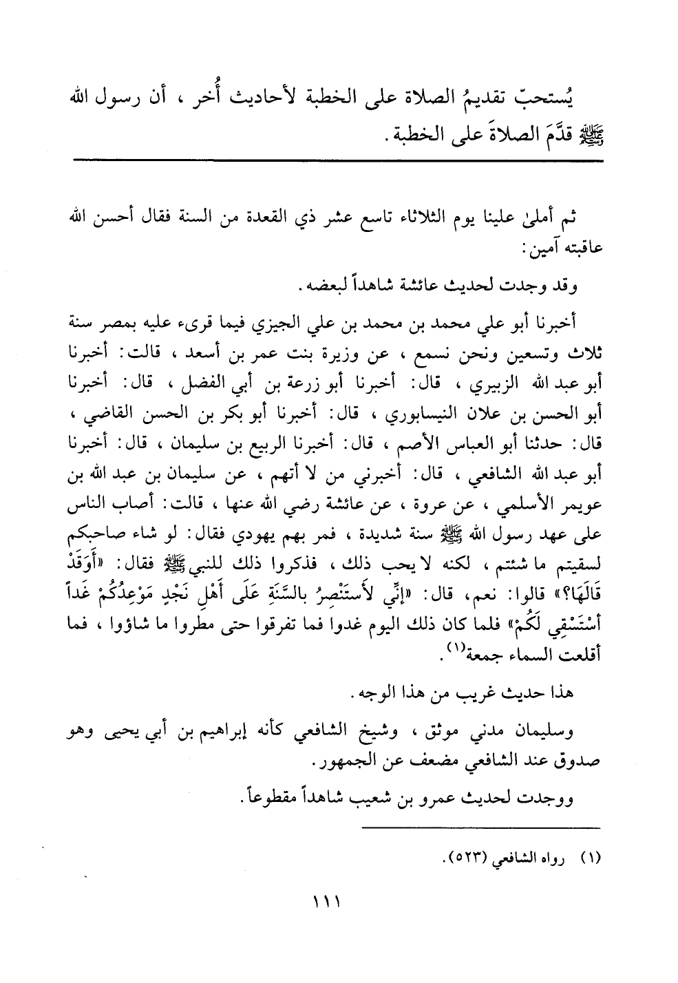 أخبرنا أبو علي محمد بن محمد بن علي الجيزي فيما قرئ عليه بمصر سنة ثلاث وتسعين ونحن نسمع، عن وزيرة بنت عمر بن أسعد، قالت: أخبرنا أبو عبد الله الزبيري، قال: أخبرنا أبو زرعة بن أبي الفضل، قال: أخبرنا أبو الحسن بن علان النيسابوري، قال: أخبرنا أبو بكر بن الحسن القاضي، قال: حدثنا أبو العباس الأصم، قال: أخبرنا الربيع بن سليمان، قال: أخبرنا أبو عبد الله الشافعي، قال: أخبرني من لا أتهم، عن سليمان بن عبد الله بن عويمر الأسلمي، عن عروة، عن عائشة رضي الله عنها، قالت: أصاب الناس على عهد رسول الله صلى الله عليه وسلم سنة شديدة، فمر بهم يهودي فقال: لو شاء صاحبكم لسقيتم ما شئتم، لكنه لا يحب ذلك، فذكروا ذلك للنبي صلى الله عليه وسلم فقال: ((أوقد قالها؟)) قالوا: نعم، قال: ((إني لأستنصر بالسنة على أهل نجدٍ موعدكم غداً أستسقي لكم)) فلما كان ذلك اليوم غدوا فما تفرقوا حتى مطروا ما شاؤوا، فما أقلعت السماء جمعة.
