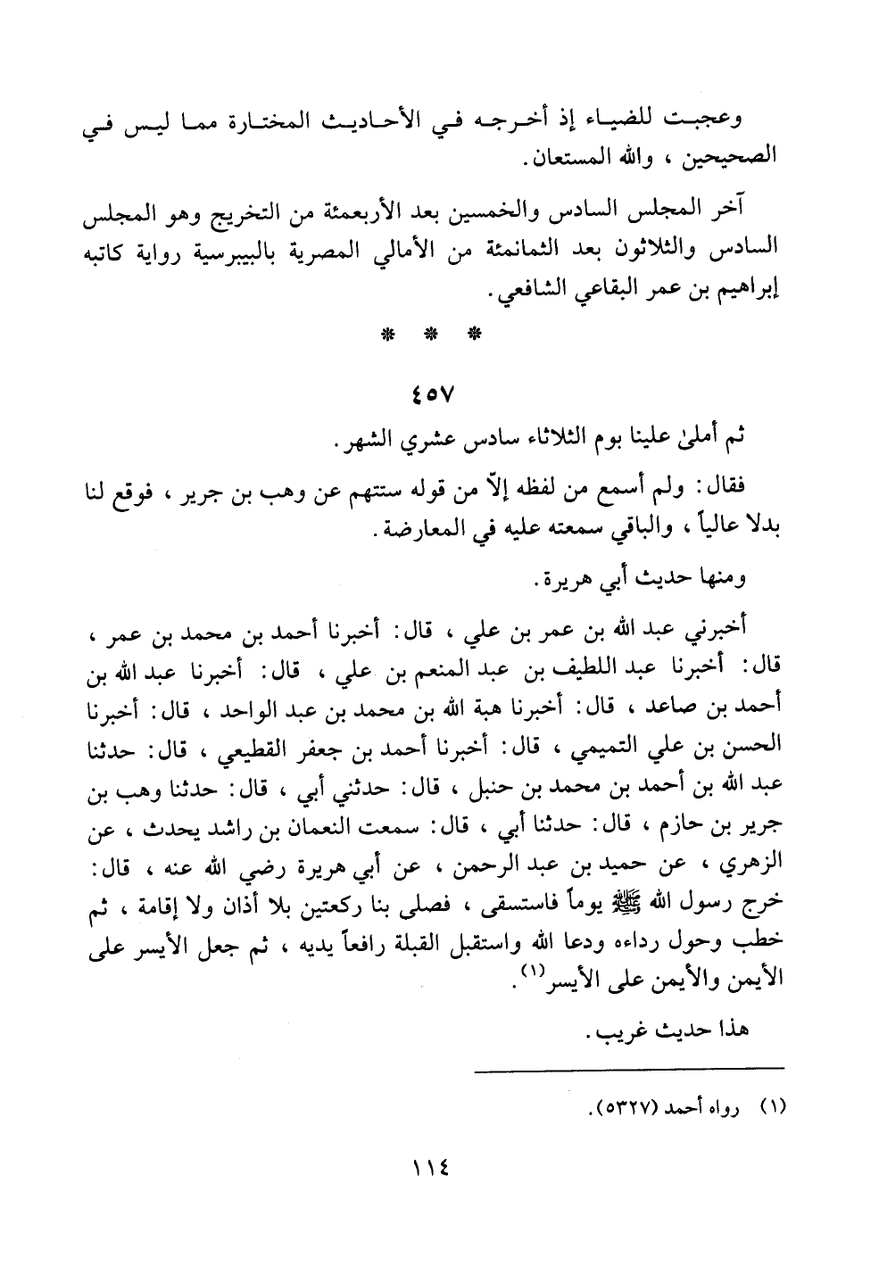 آخر المجلس السادس والخمسين بعد الأربعمئة من التخريج وهو المجلس السادس والثلاثون بعد الثمانمئة من الأمالي المصرية بالبيبرسية رواية كاتبه إبراهيم بن عمر البقاعي الشافعي.