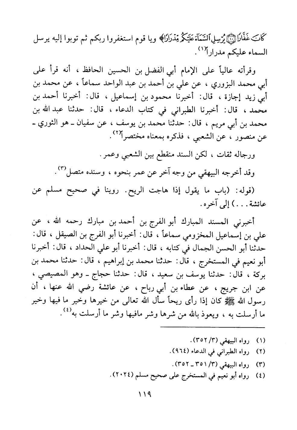 أخبرني المسند المبارك أبو الفرج بن أحمد بن مبارك رحمه الله، عن علي بن إسماعيل المخزومي سماعاً، قال: أخبرنا أبو الفرج بن الصيقل، قال: حدثنا أبو الحسن الجمال في كتابه، قال: أخبرنا أبو علي الحداد، قال: أخبرنا أبو نعيم في المستخرج، قال: حدثنا محمد بن إبراهيم، قال: حدثنا محمد بن بركة، قال: حدثنا يوسف بن سعيد، قال: حدثنا حجاج - وهو المصيصي، عن ابن جريج، عن عطاء بن أبي رباح، عن عائشة رضي الله عنها، أن رسول الله صلى الله عليه وسلم كان إذا رأى ريحاً سأل الله تعالى من خيرها وخير ما فيها وخير ما أرسلت به، ويعوذ بالله من شرها وشر ما فيها وشر ما أرسلت به.