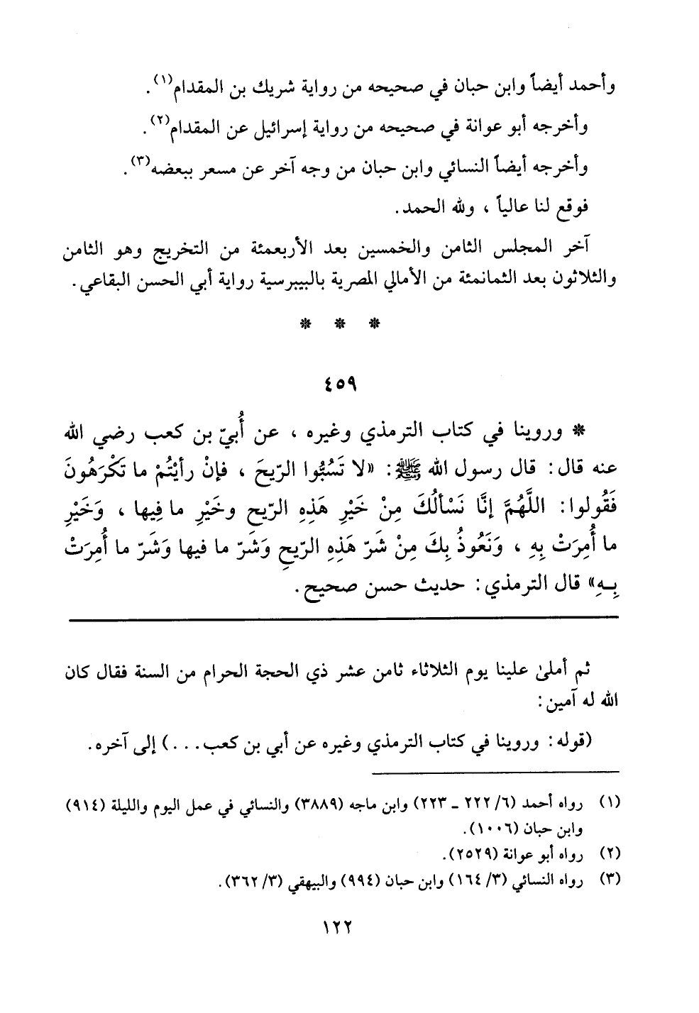 [[وروينا في كتاب الترمذي وغيره، عن أبي بن كعب رضي الله عنه قال: قال رسول الله صلى الله عليه وسلم: ((لا تسبوا الريح، فإن رأيتم ما تكرهون فقولوا: اللهم إنا نسألك من خيرٍ هذه الريح وخير ما فيها، وخيرٍ ما أمرت به، ونعوذ بك من شر هذه الريح وشر ما فيها وشر ما أمرت به)) قال الترمذي: حديث حسن صحيح.]]