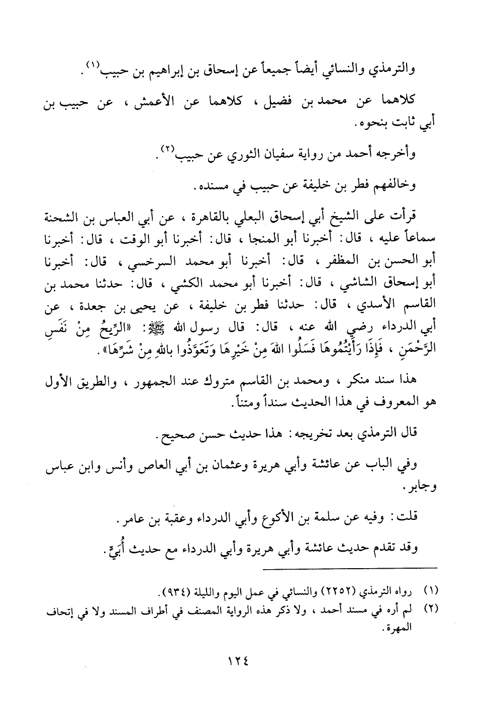 قرأت على الشيخ أبي إسحاق البعلي بالقاهرة، عن أبي العباس بن الشحنة سماعاً عليه، قال: أخبرنا أبو المنجا، قال: أخبرنا أبو الوقت، قال: أخبرنا أبو الحسن بن المظفر، قال: أخبرنا أبو محمد السرخسي، قال: أخبرنا أبو إسحاق الشاشي، قال: أخبرنا أبو محمد الكشي، قال: حدثنا محمد بن القاسم الأسدي، قال: حدثنا فطر بن خليفة، عن يحيى بن جعدة، عن أبي الدرداء رضي الله عنه، قال: قال رسول الله صلى الله عليه وسلم: ((الريح من نفس الرحمن، فإذا رأيتموها فسلوا الله من خيرها وتعوذوا بالله من شرها)).