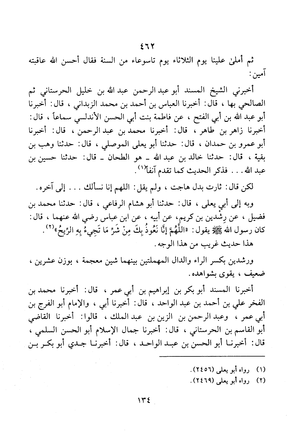 أخبرني الشيخ المسند أبو عبد الرحمن عبد الله بن خليل الحرستاني ثم الصالحي بها، قال: أخبرنا العباس بن أحمد بن محمد الزبداني، قال: أخبرنا أبو عبد الله بن أبي الفتح، عن فاطمة بنت أبي الحسن الأندلسي سماعاً، قال: أخبرنا زاهر بن طاهر، قال: أخبرنا محمد بن عبد الرحمن، قال: أخبرنا أبو عمرو بن حمدان، قال: حدثنا أبو يعلى الموصلي، قال: حدثنا وهب بن بقية، قال: حدثنا خالد بن عبد الله -هو الطحان- قال: حدثنا حسين بن عبد الله .. .. فذكر الحديث كما تقدم آنفاً.