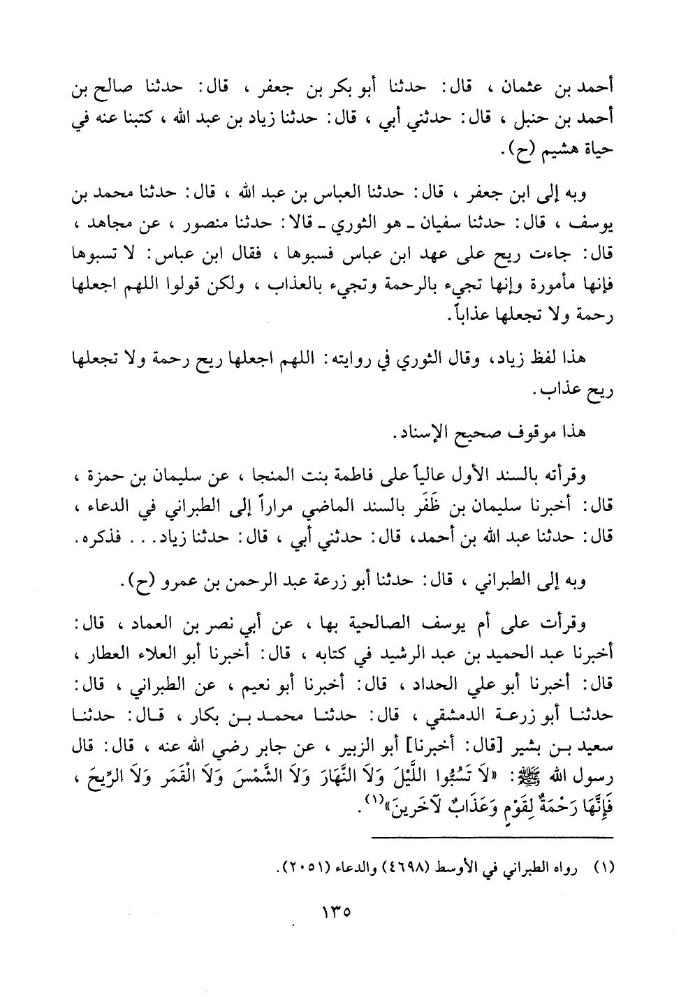 وقرأته بالسند الأول عالياً على فاطمة بنت المنجا، عن سليمان بن حمزة، قال: أخبرنا سليمان بن ظفر بالسند الماضي مراراً إلى الطبراني في الدعاء، قال: حدثنا عبد الله بن أحمد، قال: حدثني أبي، قال: حدثنا زياد .. .. فذكره.