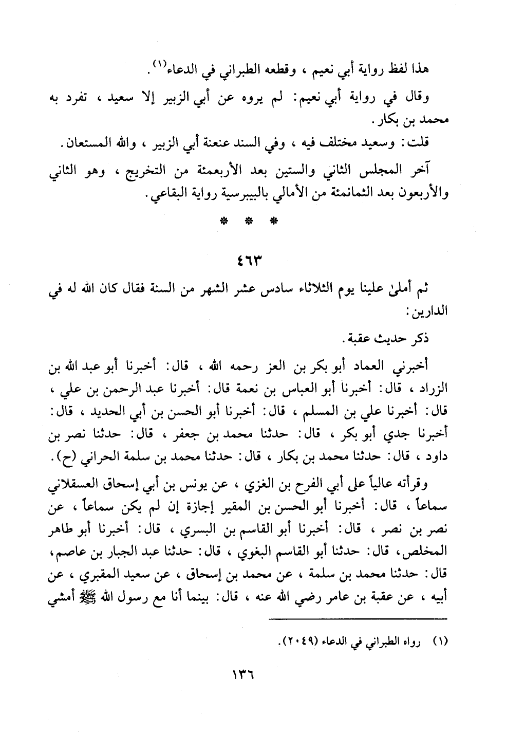 وقرأته عالياً على أبي الفرح بن الغزي، عن يونس بن أبي إسحاق العسقلاني سماعاً، قال: أخبرنا أبو الحسن بن المقير إجازة إن لم يكن سماعاً، عن نصر بن نصر، قال: أخبرنا أبو القاسم بن البسري، قال: أخبرنا أبو طاهر المخلص، قال: حدثنا أبو القاسم البغوي، قال: حدثنا عبد الجبار بن عاصم، قال: حدثنا محمد بن سلمة، عن محمد بن إسحاق، عن سعيد المقبري، عن أبيه، عن عقبة بن عامر رضي الله عنه، قال: بينما أنا مع رسول الله صلى الله عليه وسلم أمشي