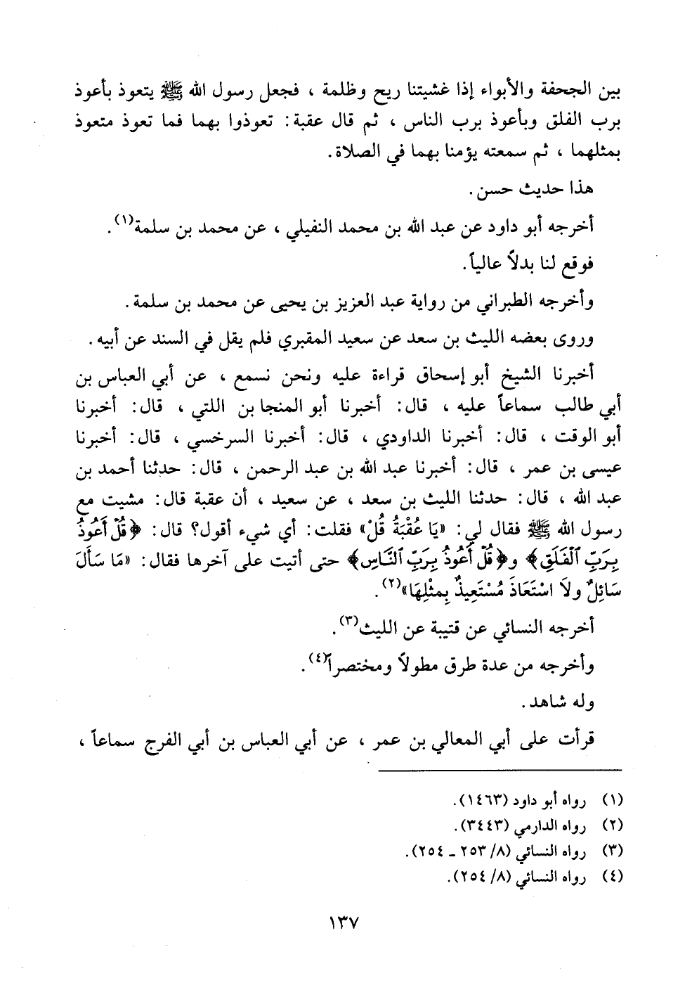 أخبرنا الشيخ أبو إسحاق قراءة عليه ونحن نسمع، عن أبي العباس بن أبي طالب سماعاً عليه، قال: أخبرنا أبو المنجا بن اللتي، قال: أخبرنا أبو الوقت، قال: أخبرنا الداودي، قال: أخبرنا السرخسي، قال: أخبرنا عيسى بن عمر، قال: أخبرنا عبد الله بن عبد الرحمن، قال: حدثنا أحمد بن عبد الله، قال: حدثنا الليث بن سعد، عن سعيد، أن عقبة قال: مشيت مع رسول الله صلى الله عليه وسلم فقال لي: ((يا عقبة قل)) فقلت: أي شيء أقول؟ قال: {قل أعوذ برب الفلق} و{قل أعوذ برب الناس} حتى أتيت على آخرها فقال: ((ما سأل سائلٌ ولا استعاذ مستعيذٌ بمثلها)).