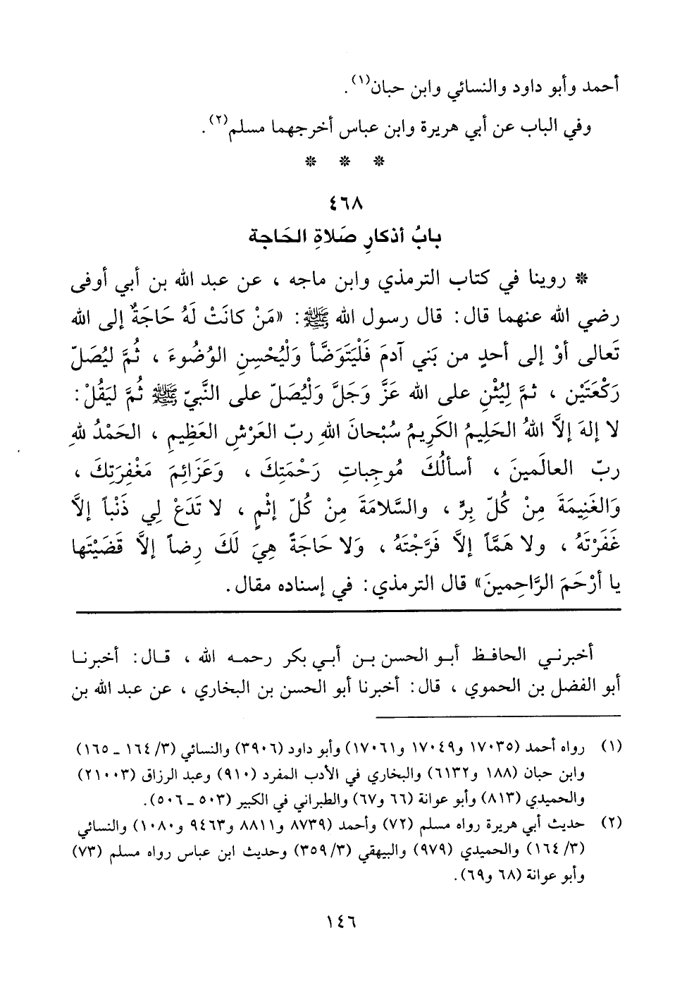 روينا في كتاب الترمذي وابن ماجه، عن عبد الله بن أبي أوفى رضي الله عنهما قال: قال رسول الله صلى الله عليه وسلم: ((من كانت له حاجةٌ إلى الله تعالى أو إلى أحدٍ من بني آدم فليتوضأ وليحسن الوضوء، ثم ليصل ركعتين، ثم ليثن على الله عز وجل وليصل على النبي صلى الله عليه وسلم ثم ليقل: لا إله إلا الله الحليم الكريم سبحان الله رب العرش العظيم، الحمد لله رب العالمين، أسألك موجبات رحمتك، وعزائم مغفرتك، والغنيمة من كل بر، والسلامة من كل إثمٍ، لا تدع لي ذنباً إلا غفرته، ولا هماً إلا فرجته، ولا حاجةً هي لك رضاً إلا قضيتها يا أرحم الراحمين)) قال الترمذي: في إسناده مقال.]]