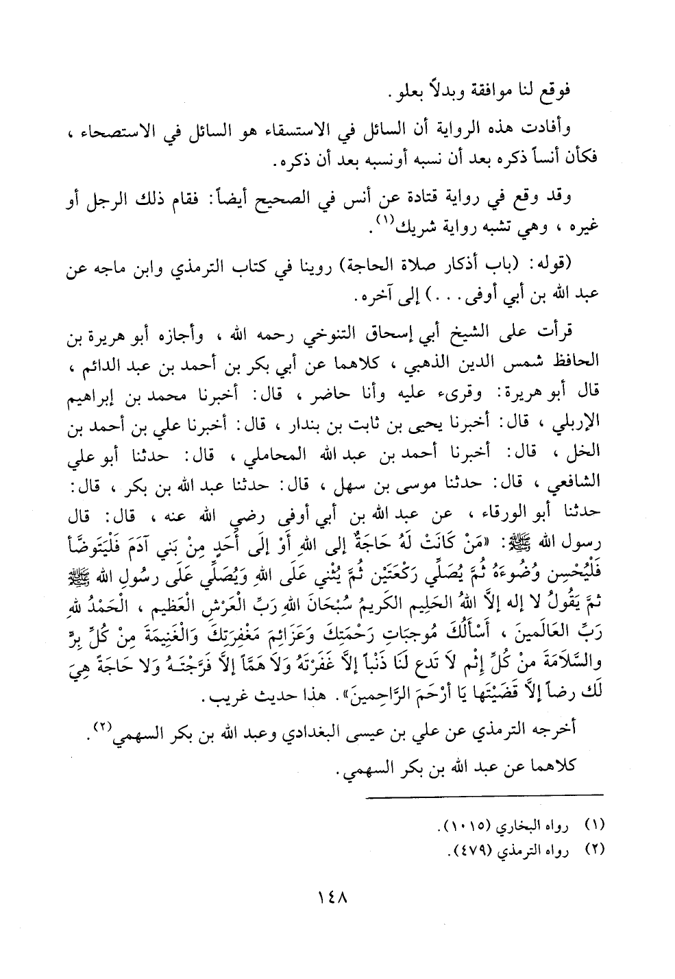 قرأت على الشيخ أبي إسحاق التنوخي رحمه الله، وأجازه أبو هريرة بن الحافظ شمس الدين الذهبي، كلاهما عن أبي بكر بن أحمد بن عبد الدائم، قال أبو هريرة: وقرئ عليه وأنا حاضر، قال: أخبرنا محمد بن إبراهيم الإربلي، قال: أخبرنا يحيى بن ثابت بن بندار، قال: أخبرنا علي بن أحمد بن الخل، قال: أخبرنا أحمد بن عبد الله المحاملي، قال: حدثنا أبو علي الشافعي، قال: حدثنا موسى بن سهل، قال: حدثنا عبد الله بن بكر، قال: حدثنا أبو الورقاء، عن عبد الله بن أبي أوفى رضي الله عنه، قال: قال رسول الله صلى الله عليه وسلم: ((من كانت له حاجةٌ إلى الله أو إلى أحدٍ من بني آدم فليتوضأ فليحسن وضوءه ثم يصلي ركعتين ثم يثني على الله ويصلي على رسول الله صلى الله عليه وسلم ثم يقول لا إله إلا الله الحليم الكريم سبحان الله رب العرش العظيم، الحمد لله رب العالمين، أسألك موجبات رحمتك وعزائم مغفرتك والغنيمة من كل بر والسلامة من كل إثم لا تدع لنا ذنباً إلا غفرته ولا هماً إلا فرجته ولا حاجةً هي لك رضاً إلا قضيتها يا أرحم الراحمين)). هذا حديث غريب.