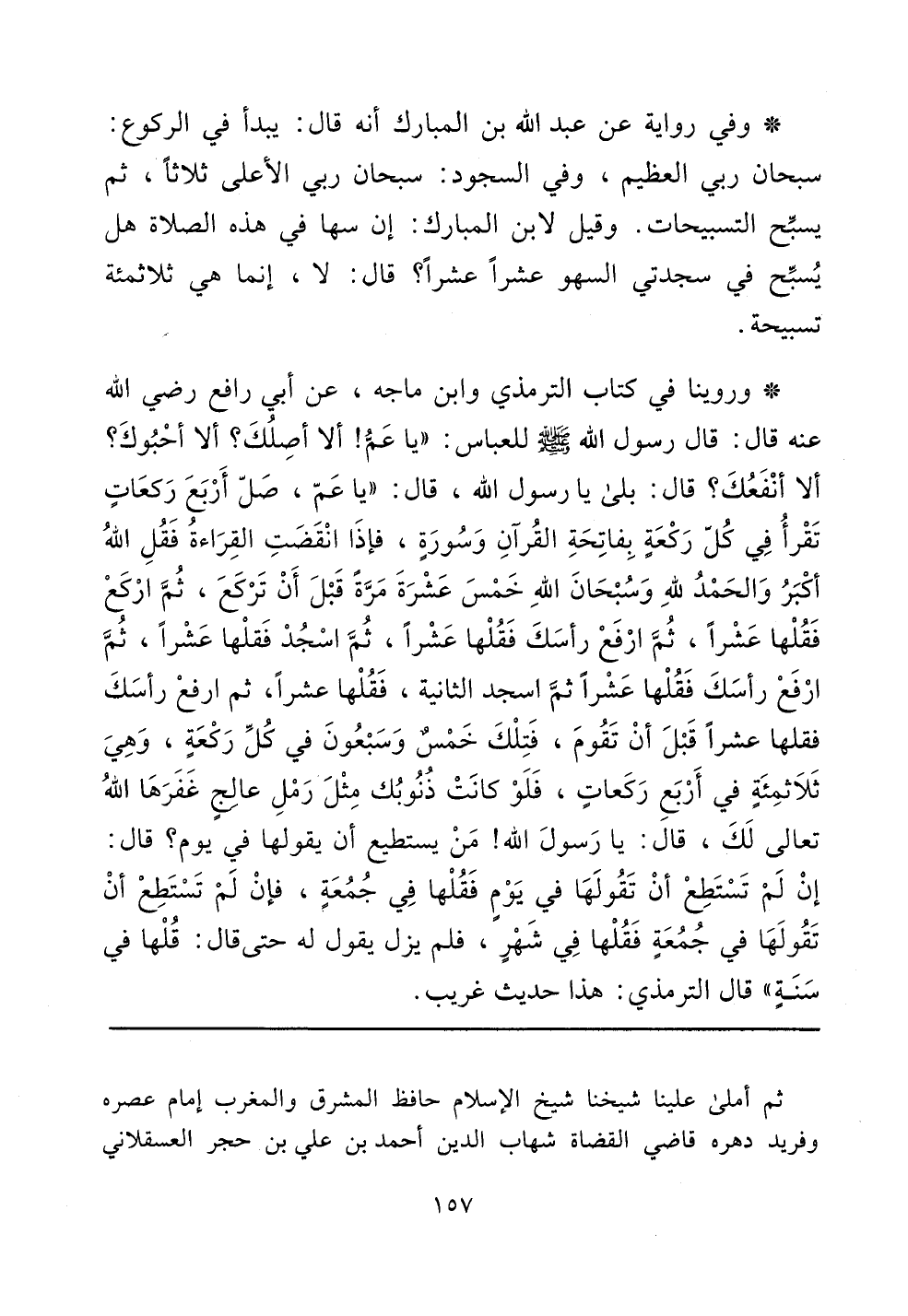 وروينا في كتاب الترمذي وابن ماجه، عن أبي رافع رضي الله عنه قال: قال رسول الله صلى الله عليه وسلم للعباس: ((يا عم! ألا أصلك؟ ألا أحبوك؟ ألا أنفعك؟ قال: بلى يا رسول الله، قال: ((يا عم، صل أربع ركعاتٍ تقرأ في كل ركعةٍ بفاتحة القرآن وسورةٍ، فإذا انقضت القراءة فقل الله أكبر والحمد لله وسبحان الله خمس عشرة مرةً قبل أن تركع، ثم اركع فقلها عشراً، ثم ارفع رأسك فقلها عشراً، ثم اسجد فقلها عشراً، ثم ارفع رأسك فقلها عشراً ثم اسجد الثانية، فقلها عشراً، ثم ارفع رأسك فقلها عشراً قبل أن تقوم، فتلك خمسٌ وسبعون في كل ركعةٍ، وهي ثلاثمئةٍ في أربع ركعاتٍ، فلو كانت ذنوبك مثل رمل عالجٍ غفرها الله تعالى لك، قال: يا رسول الله! من يستطيع أن يقولها في يوم؟ قال: إن لم تستطع أن تقولها في يومٍ فقلها في جمعةٍ، فإن لم تستطع أن تقولها في جمعةٍ فقلها في شهرٍ، فلم يزل يقول له حتى قال: قلها في سنةٍ)) قال الترمذي: هذا حديث غريب.]]