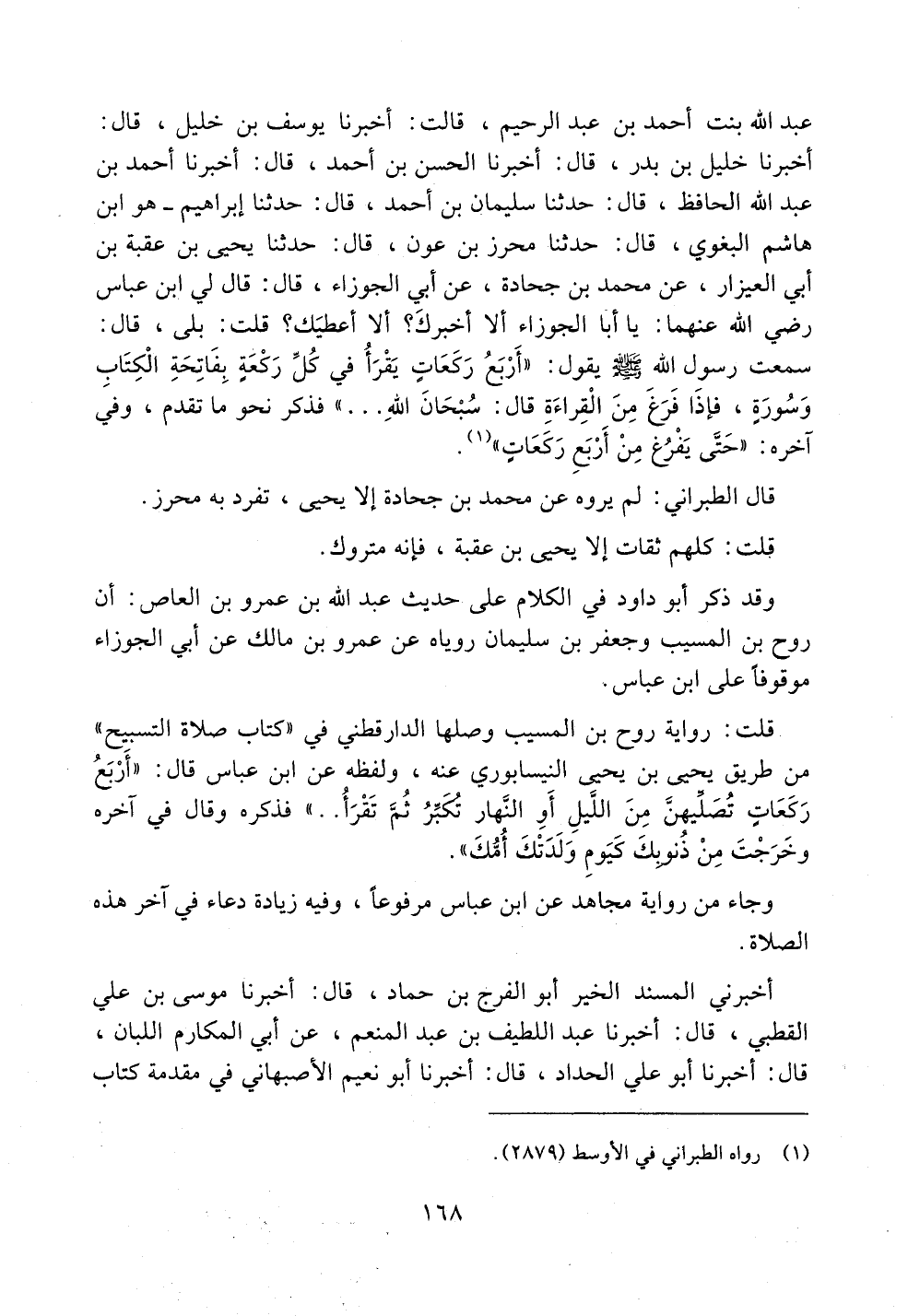 عبد الله بنت أحمد بن عبد الرحيم، قالت: أخبرنا يوسف بن خليل، قال: أخبرنا خليل بن بدر، قال: أخبرنا الحسن بن أحمد، قال: أخبرنا أحمد بن عبد الله الحافظ، قال: حدثنا سليمان بن أحمد، قال: حدثنا إبراهيم -هو ابن هاشم البغوي- قال: حدثنا محرز بن عون، قال: حدثنا يحيى بن عقبة بن أبي العيزار، عن محمد بن جحادة، عن أبي الجوزاء، قال: قال لي ابن عباس رضي الله عنهما: يا أبا الجوزاء ألا أخبرك؟ ألا أعطيك؟ قلت: بلى، قال: سمعت رسول الله صلى الله عليه وسلم يقول: ((أربع ركعاتٍ يقرأ في كل ركعةٍ بفاتحة الكتاب وسورةٍ، فإذا فرغ من القراءة قال: سبحان الله .. .. )) فذكر نحو ما تقدم، وفي آخره: ((حتى يفرغ من أربع ركعاتٍ)).